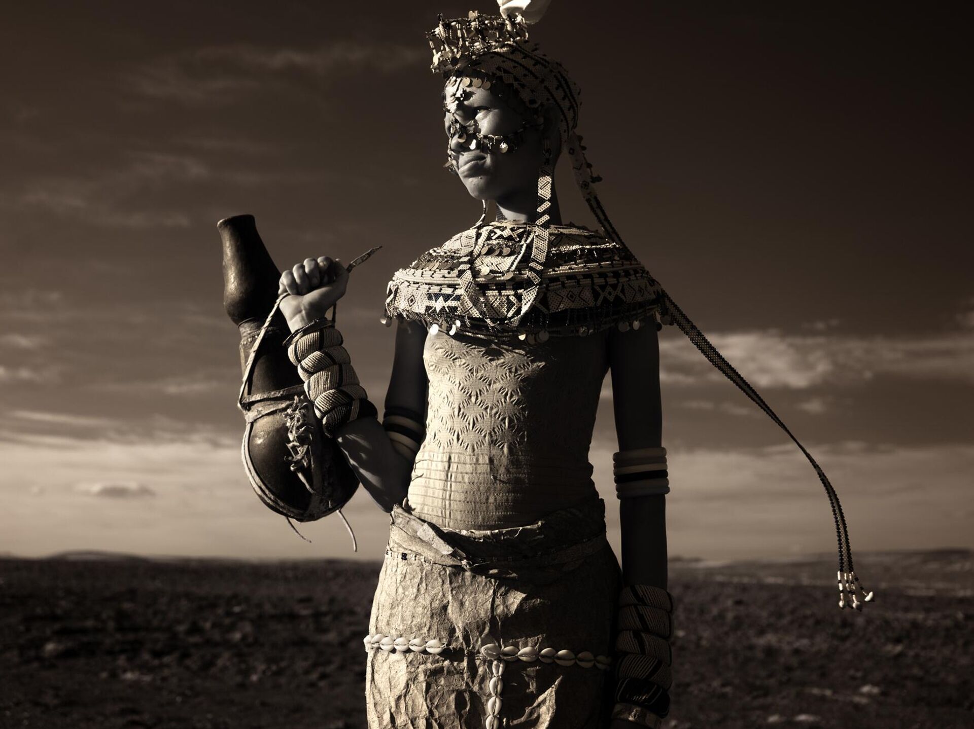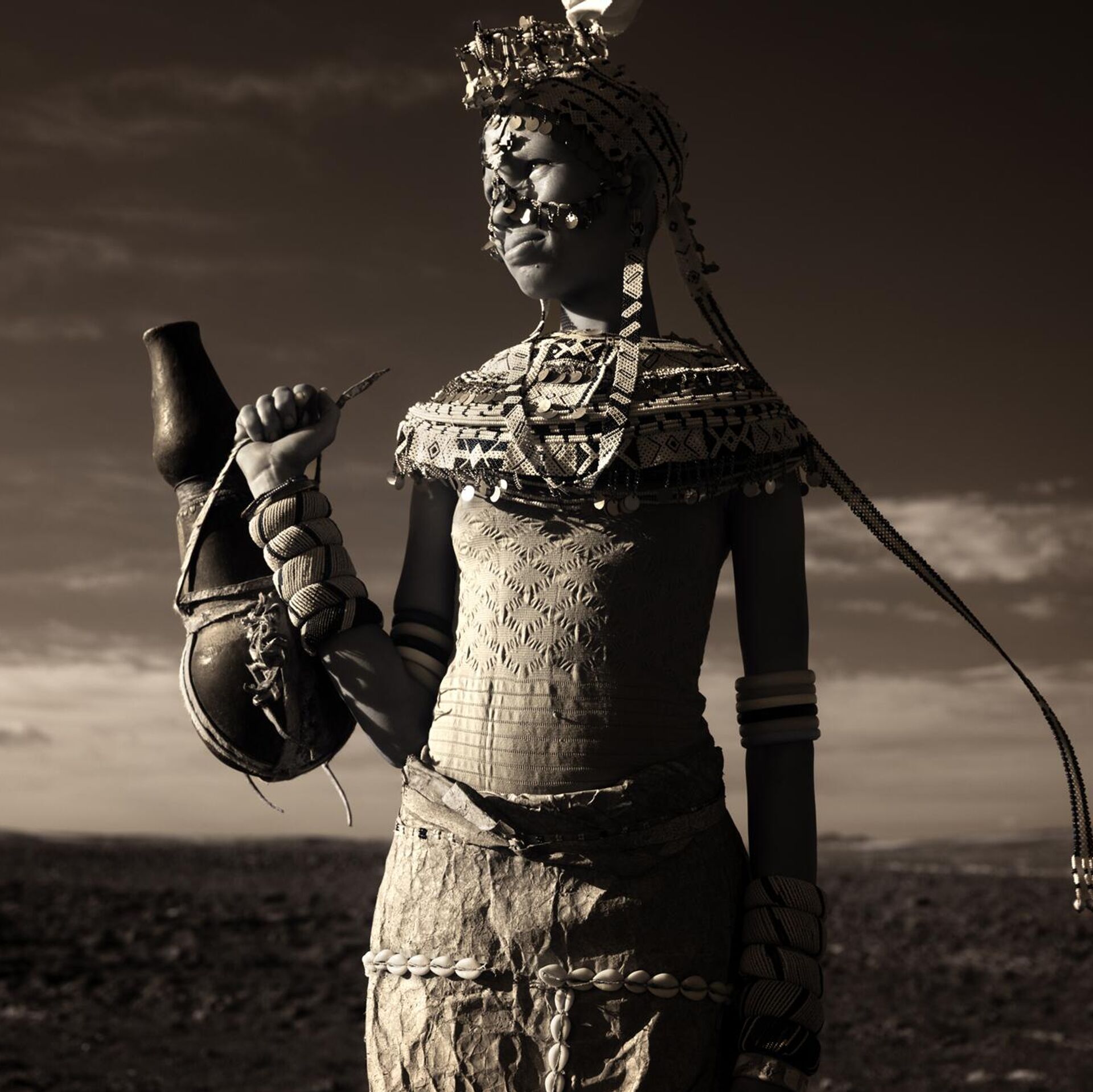 Девојка из Кеније у традиционалној одећи спрема се за венчање. Њена хаљина садржи перле, слојеве кравље коже и других ручно израђених елемената. - Sputnik Србија