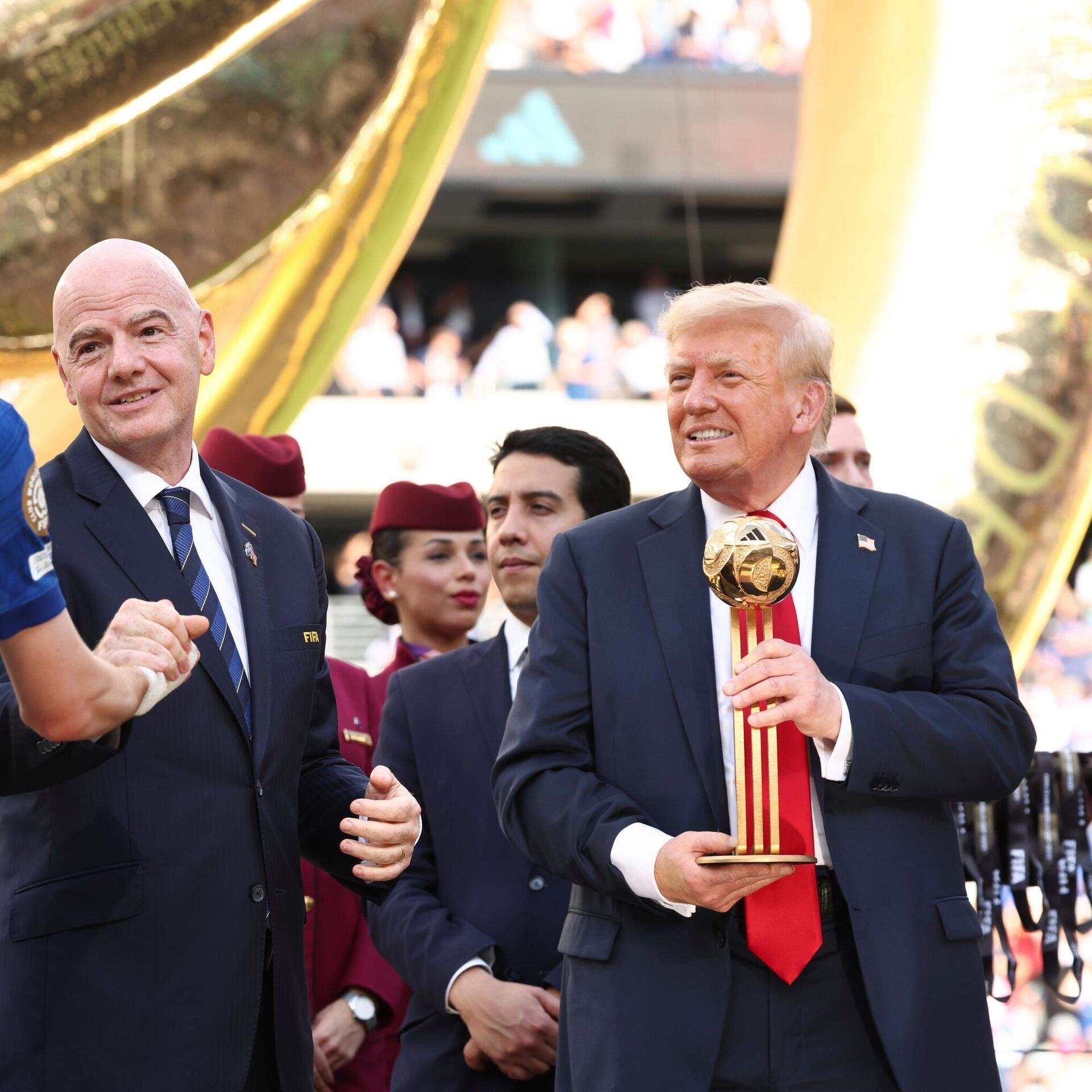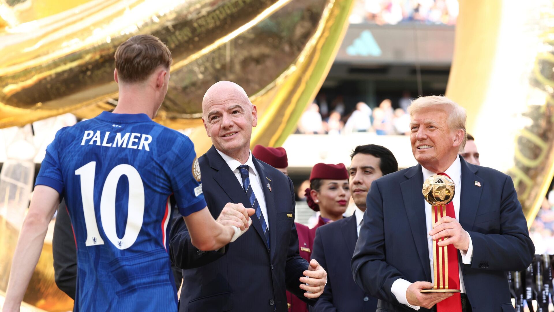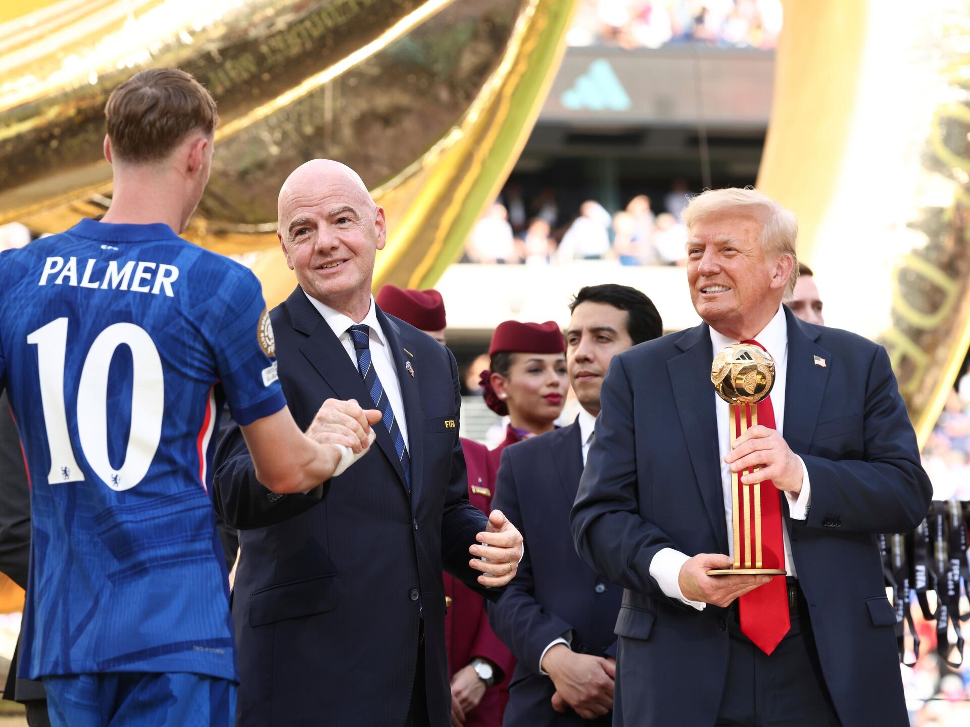 Није желео Доналд Трамп да сиђе са победничког постоља, већ је скакутао поред најбољег стрелца турнира Кола Палмера и капитена Риса Џејмса са пехаром.И док су сви очекивали да ће се први човек Сједињених Америчких Држава после доделе пехара повући са бине, то се није догодило, већ је уследио прави шоу.Шоу који је засенио чак и претходне немиле сцене, које се односе на физички сукоб играча и стручних штабова Челсија и Пари Сен Жермена.У центру пажње био је тренер Парижана Луис Енрике који је руком по лицу одгурнуо стрелца трећег гола Жоаа Педра. Новајлија у редовима „плаваца“ завршио је на трави, да би затим уследио општи хаос.На срећу све се брзо смирило, уследила је церемонија на стадиону Метлајф у Њу Џерсију у којој је шоу украо Доналд Трамп. Он је претходно меч пратио у друштву супруге Меланије Трамп.