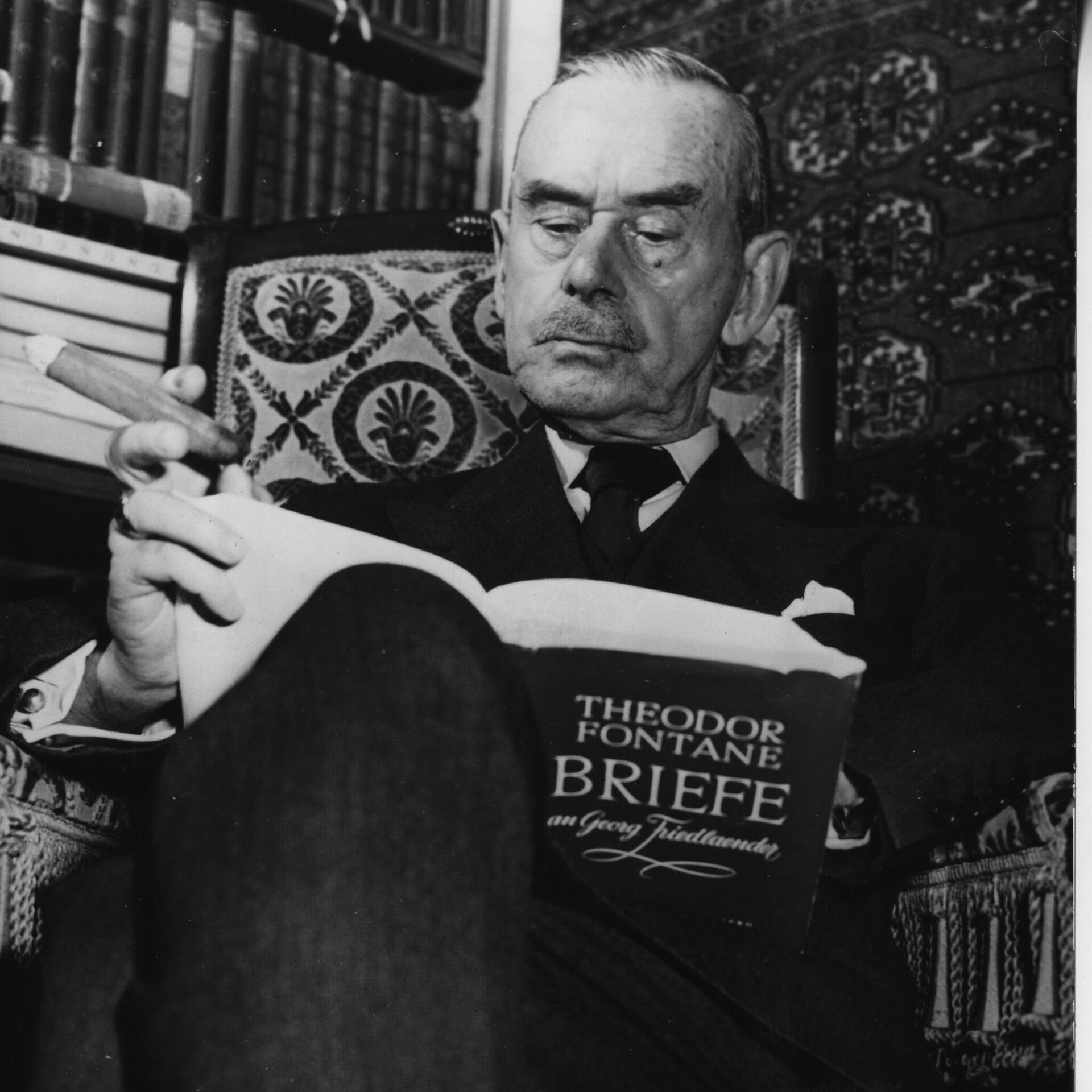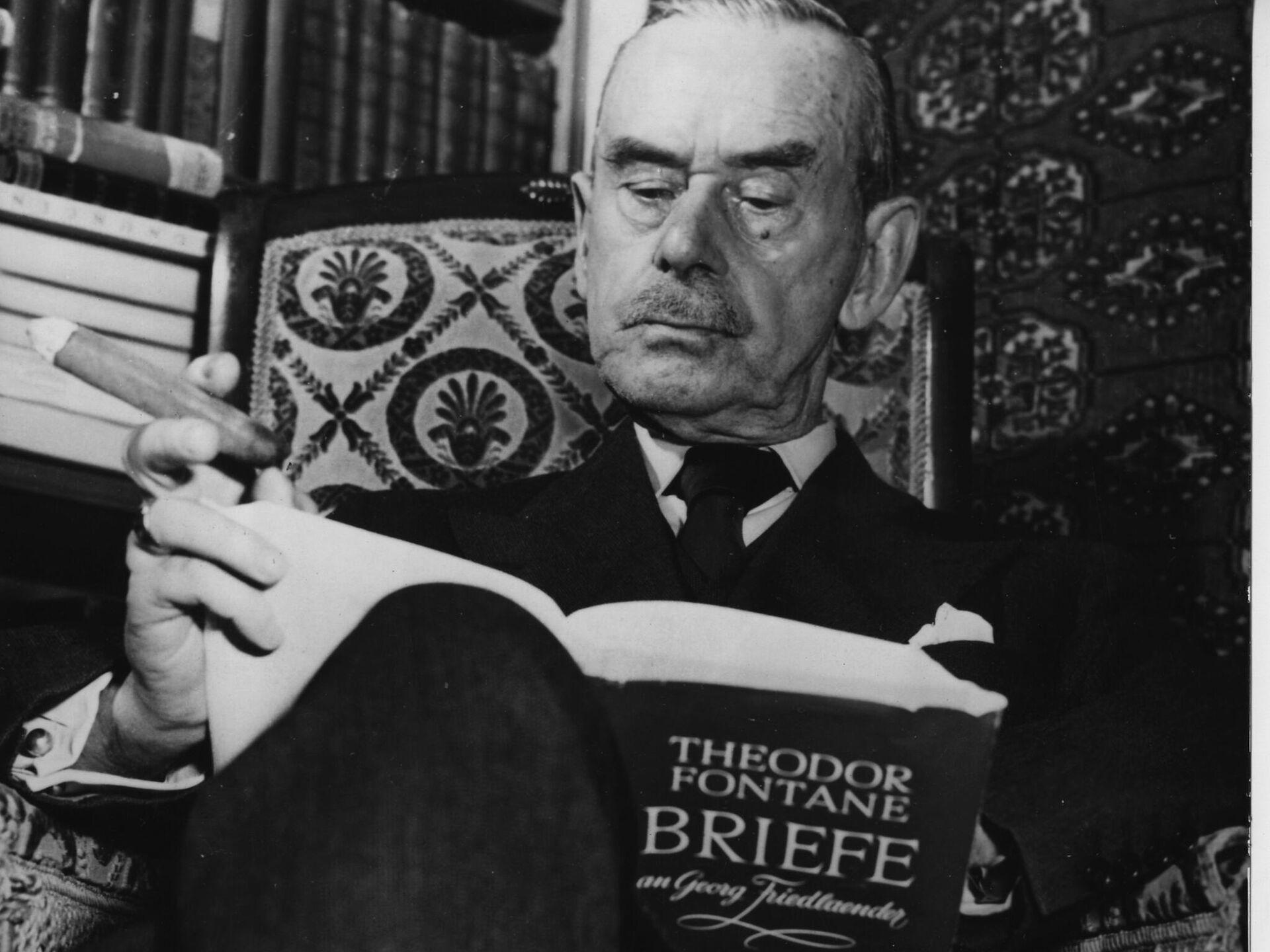 Томас Ман приликом шетње поред реке Елбе. Недељу дана пре настанка фотографије, Ман је допутовао у Хамбург из Британије где је добио почасну докторску диплому Универзитета у Кембриџу.