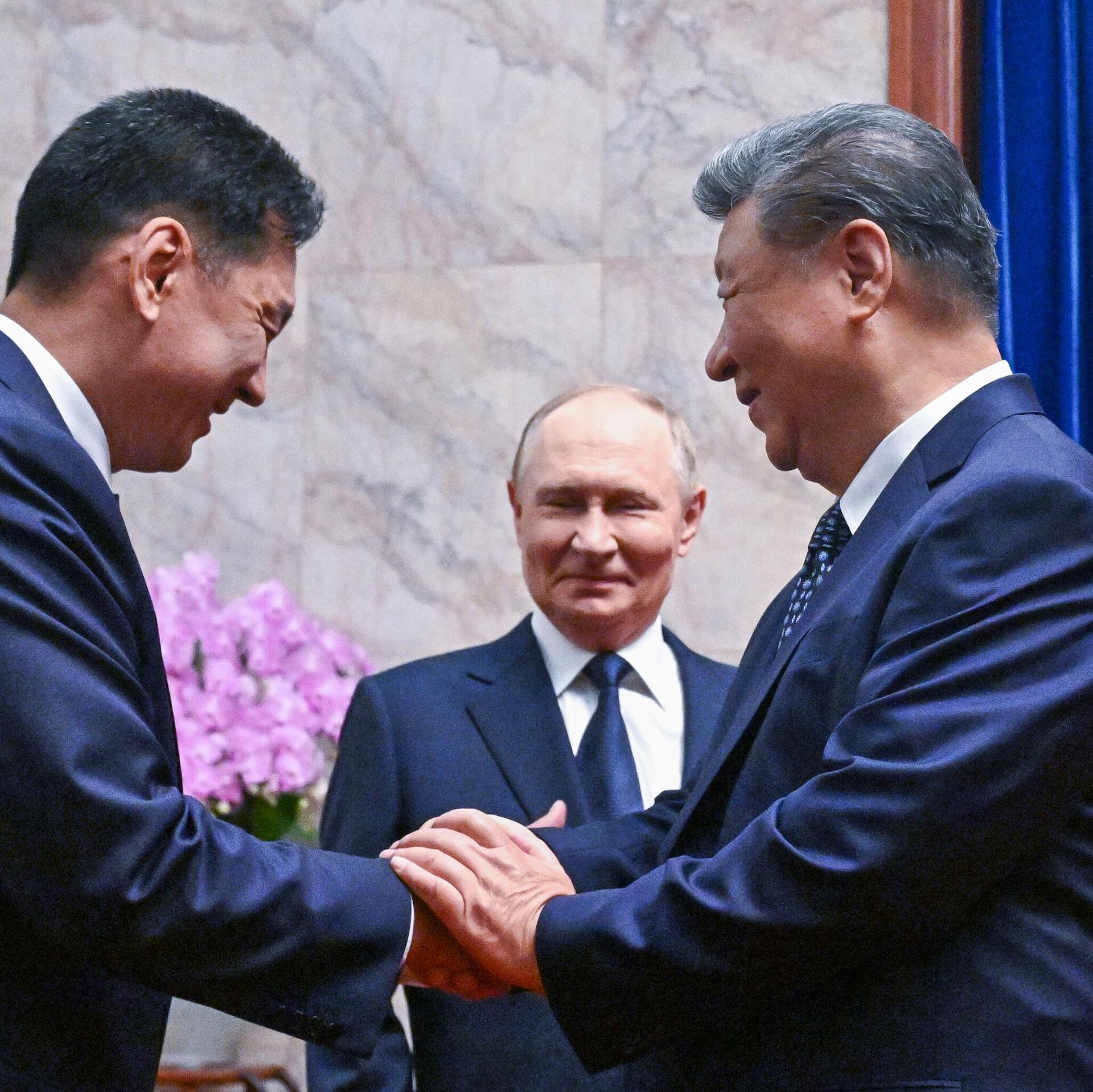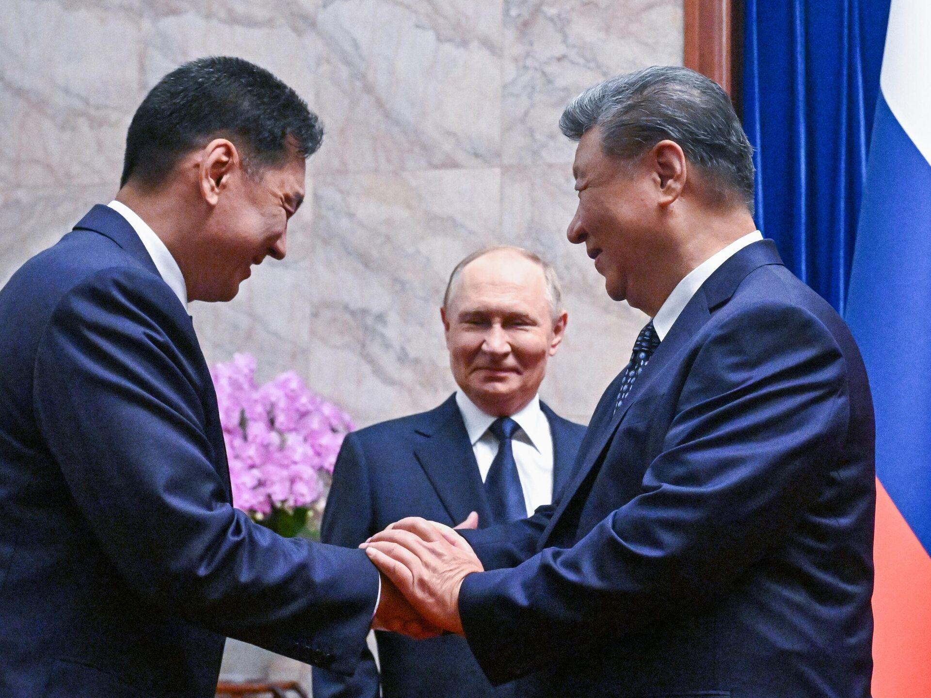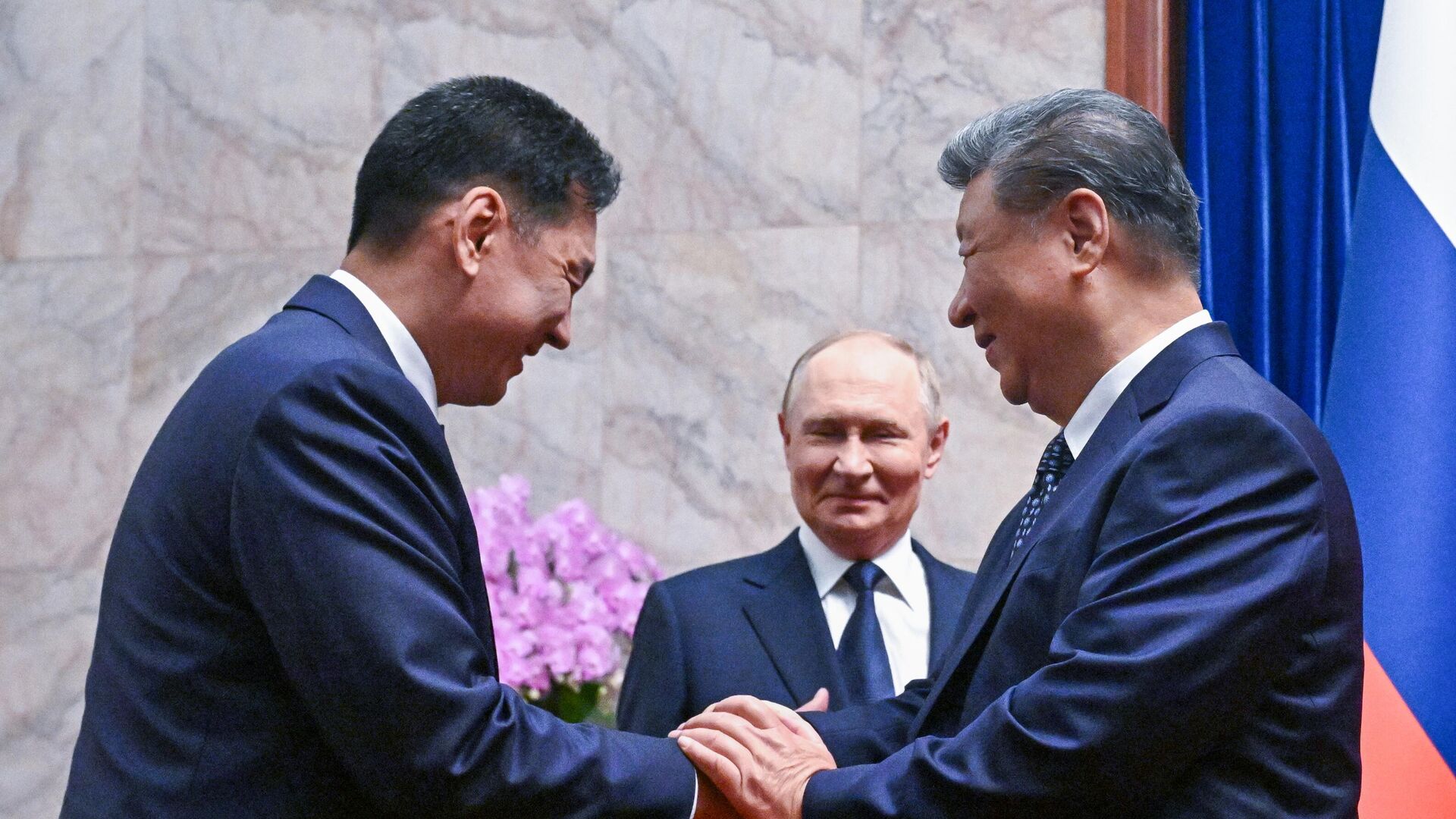 Руски председник Владимир Путин, председник Народне Републике Кине (НРК) Си Ђинпинг и председник Монголије Ухнагијн Хурелсух током заједничког фотографисања у Пекингу.