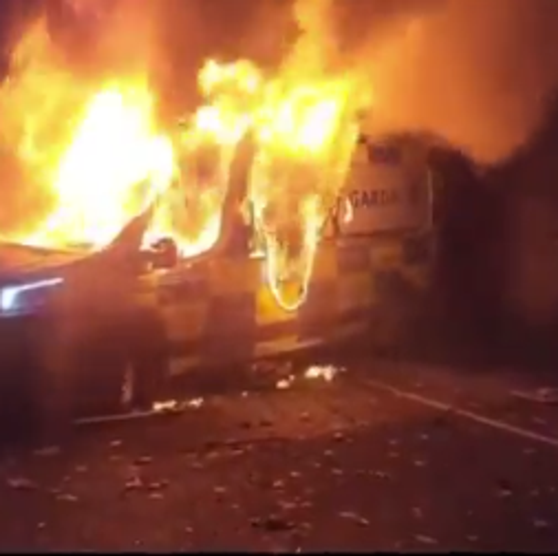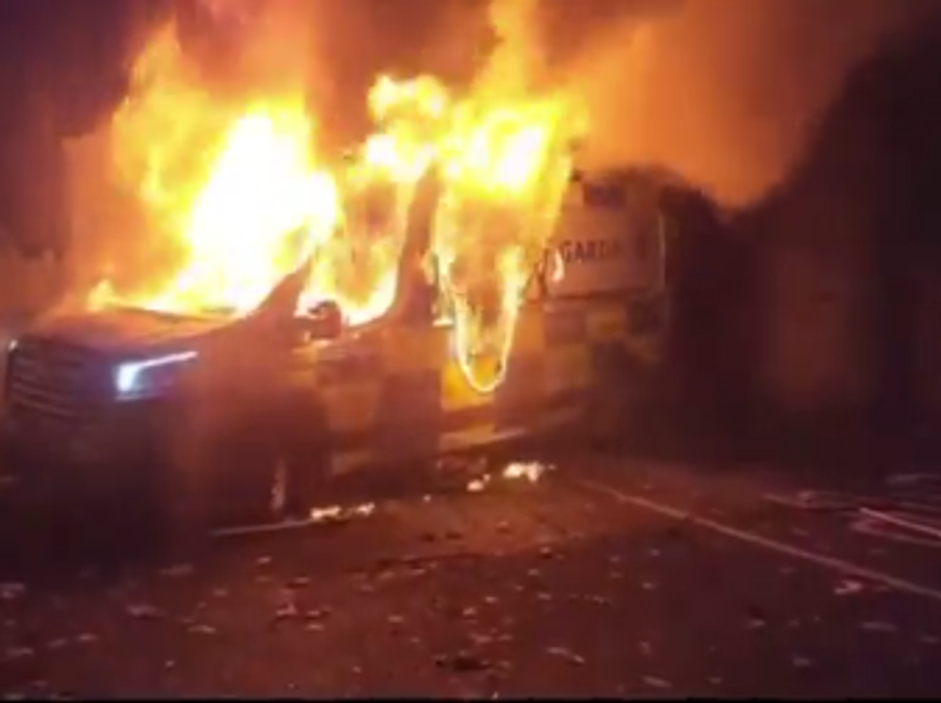 Снимци запаљеног полицијског комбија које су поделили ирски медији и антимигрантске групе на мрежи Икс, приказивали демонстранте с ирским заставама и транспарентима с антиимигрантским порукама,