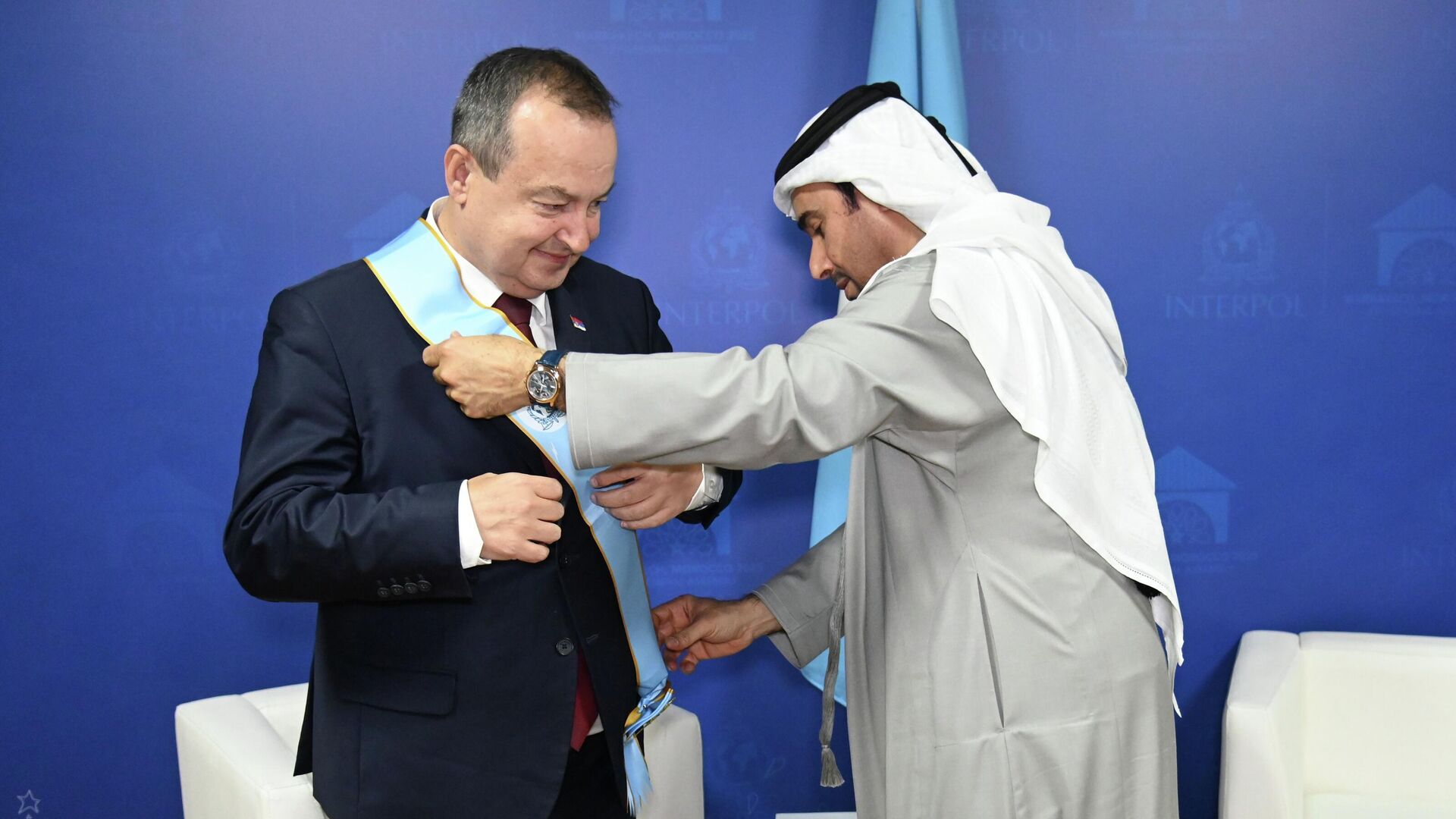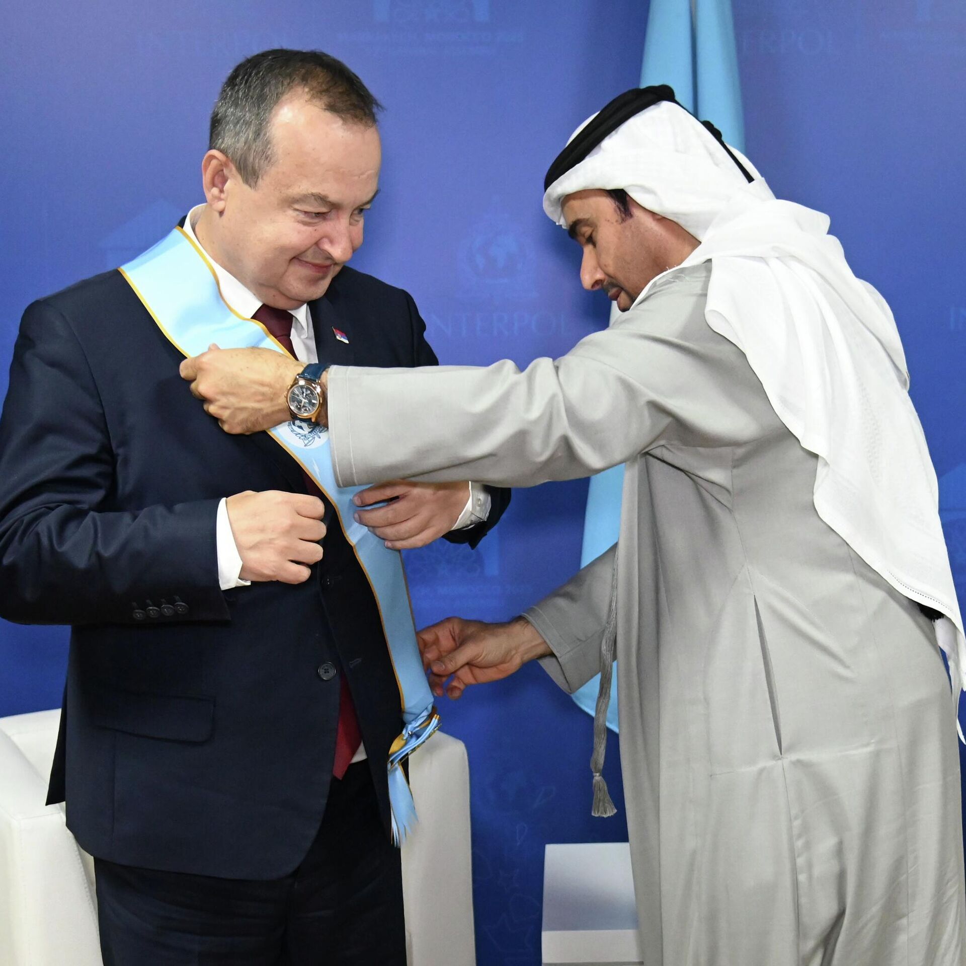 "Медаља посебног ранга представља израз искрене захвалности ове организације за Вашу непоколебљиву посвећеност унапређењу међународне сарадње у области спровођења закона и за Ваш делотворан допринос изградњи безбеднијег и праведнијег света за све", наводи се у престижном признању Интерпола које је министру Дачићу уручио председник Интерпола Ахмед Насер Ал-Раиси.