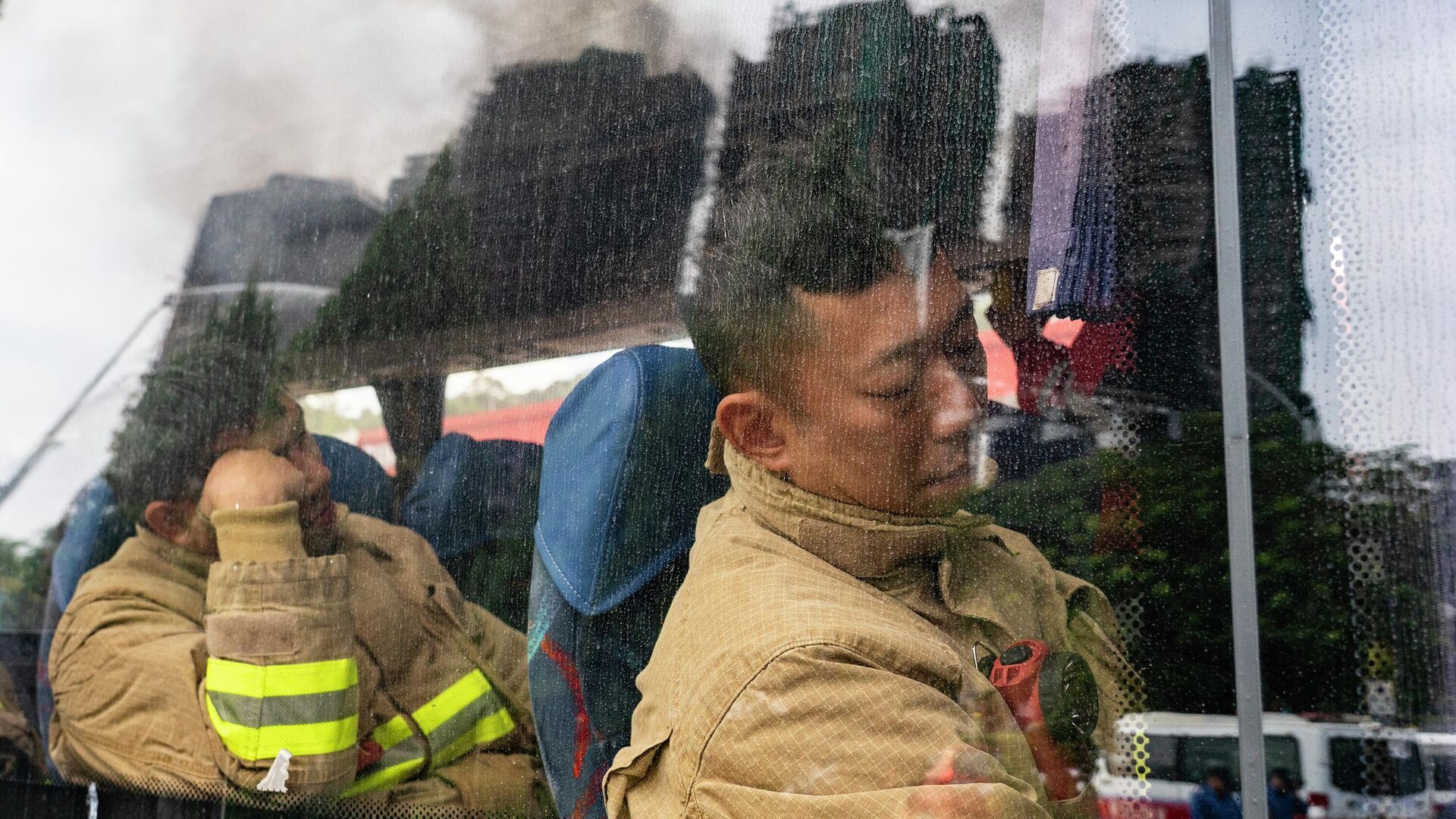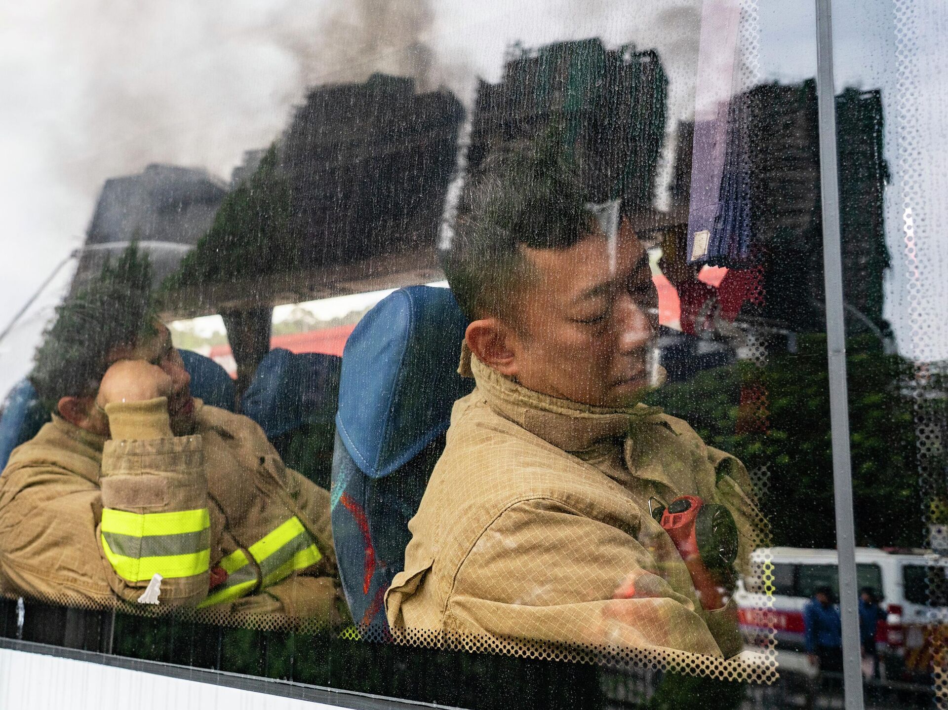 Исцрпљени ватрогасци одмарају док се не врате на позицију.