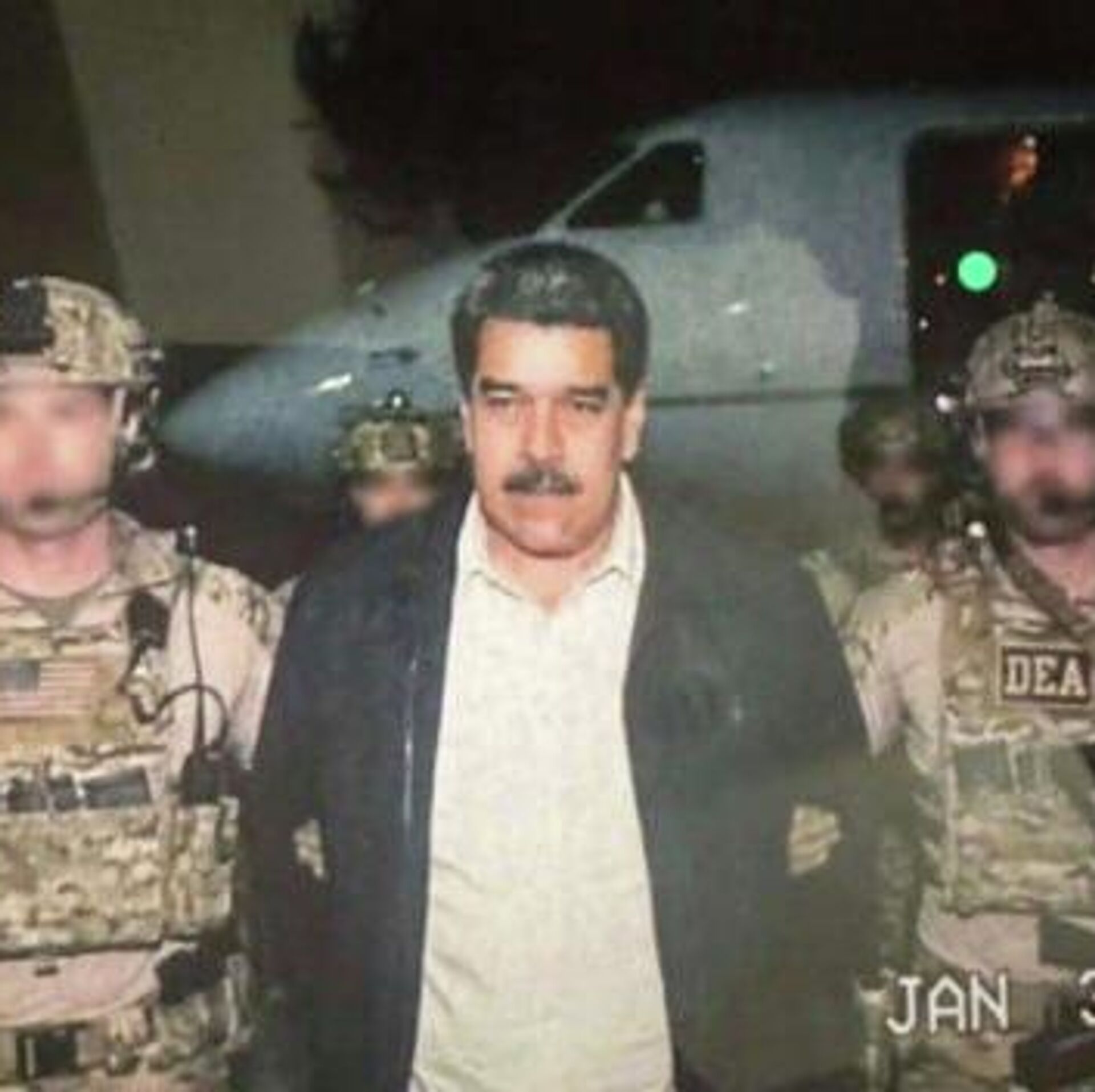 Аутентичност фотографије није потврђена.Подсетимо, раније данас амерички председник Доналд Трамп саопштио је да је америчка војска извела операцију великог обима у Венецуели и да су Мадуро и његова жена ухваћени и одведени из земље.Погледајте и: