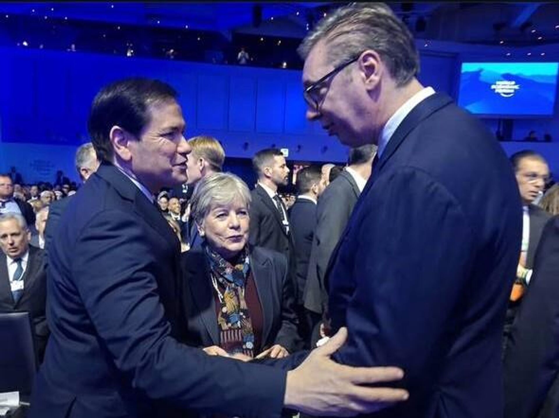 „Срдачан кратак сусрет са Марком Рубиом са којим сам разменио мишљења о актуелним глобалним политичким кретањима и изазовима, као и о темама овогодишњег Светског економског форума у Давосу. Указао сам на позиције Србије о главним геополитичким питањима и изразио уверење да ће односи наше земље и САД наставити да јачају у областима од узајамног интереса, јер Србија, иако мала земља, има изузетну репутацију као доследан и поуздан партнер у сложеном међународном контексту“, навео је Вучић у објави на друштвеним мрежама.