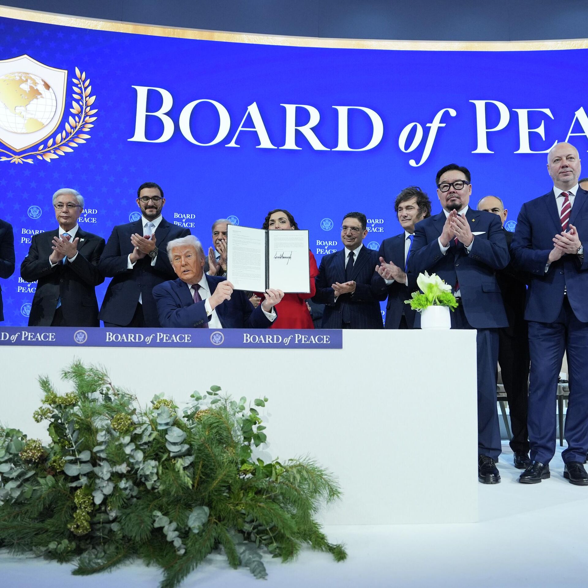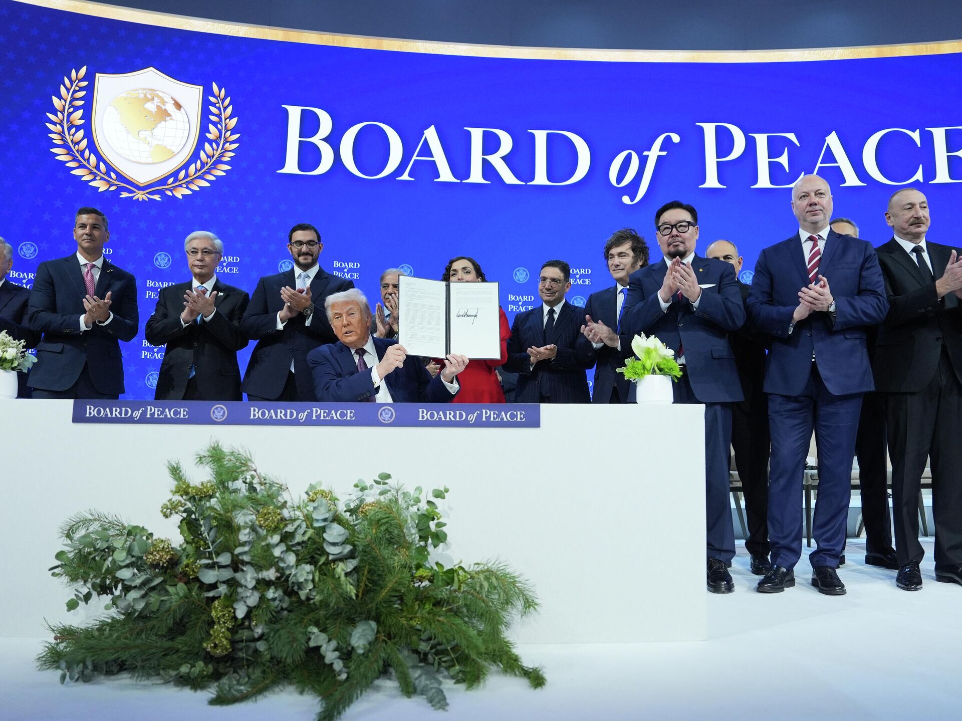 Објављивања повеље за Савет мира током годишњег састанка Светског економског форума у Давосу: С десна на лево, Ајман Ал Сафади, заменик премијера Јордана, Прабово Субинато, председник Индонезије, мађарски премијер Виктор Орбан, бугарски премијер Росен Жељазков, Илхам Алијев, председник Доналд Трамп, председник Азербејџана, турски министар спољних послова Хакан Фидан, Никол Пашињан, премијер Јерменије и Хавијер Милеи, председник Аргентине