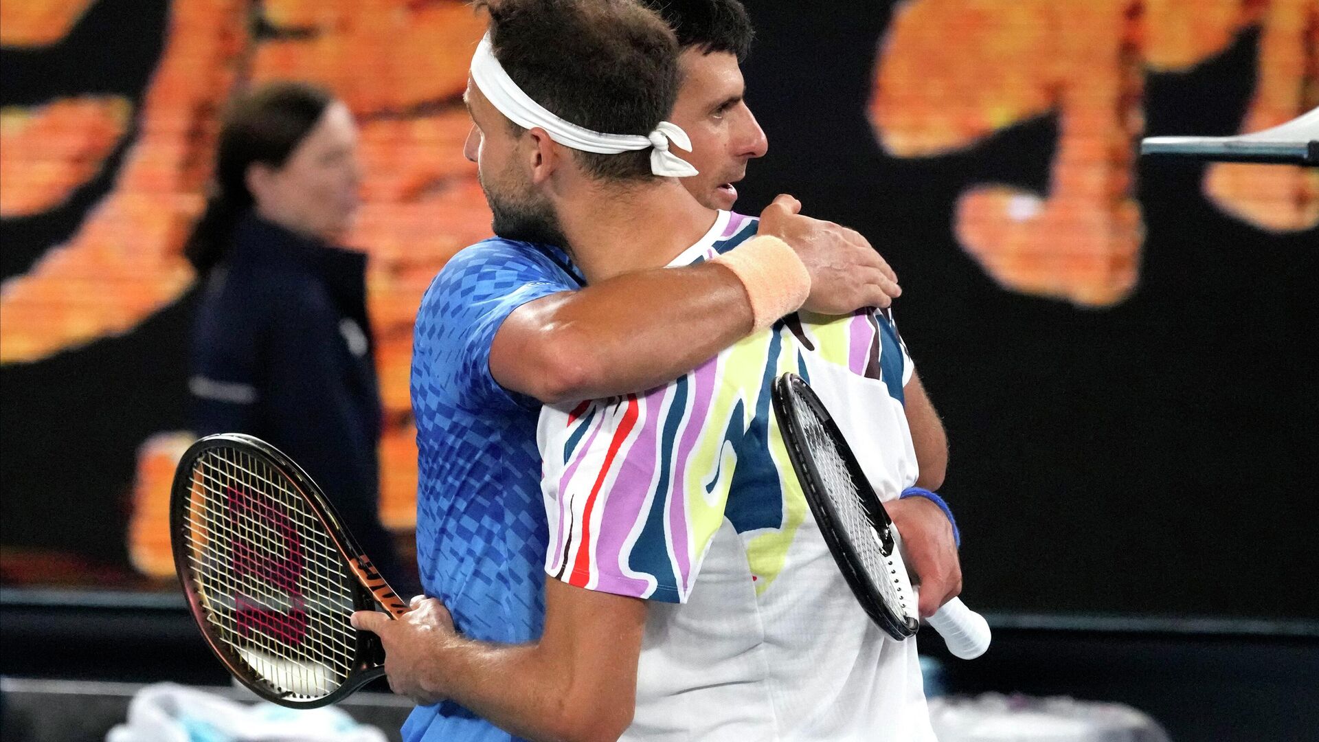 © AP Photo / Aaron FavilaНовак Ђоковић грли Григора Димитрова из након њиховог меча трећег кола на Отвореном првенству Аустралије у тенису у Мелбурну