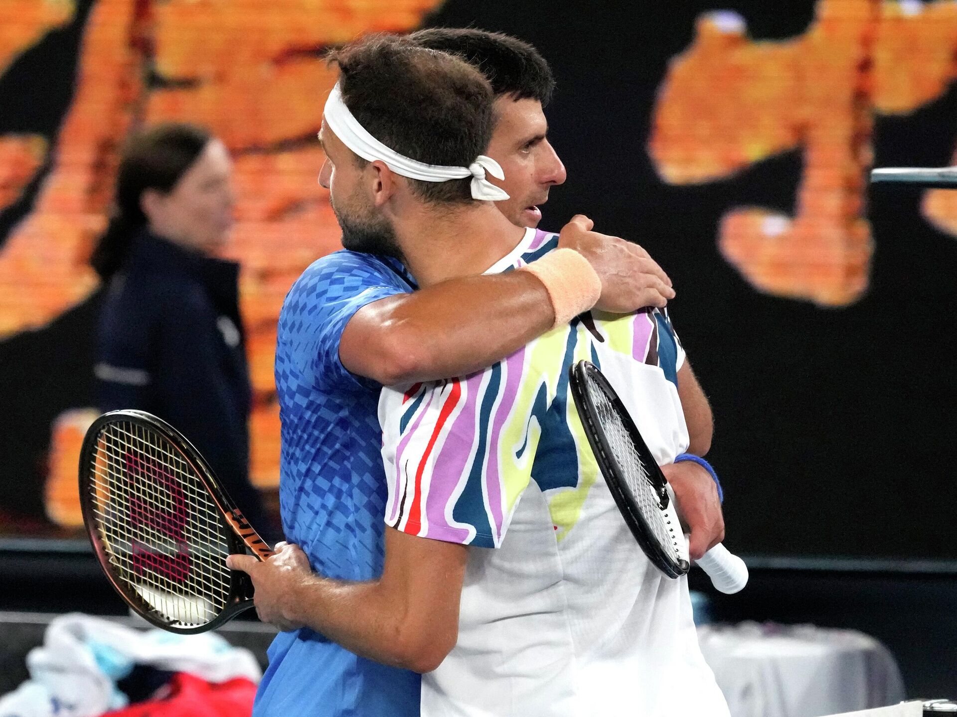 Новак Ђоковић грли Григора Димитрова из након њиховог меча трећег кола на Отвореном првенству Аустралије у тенису у Мелбурну - Sputnik Србија, 1920, 23.01.2026