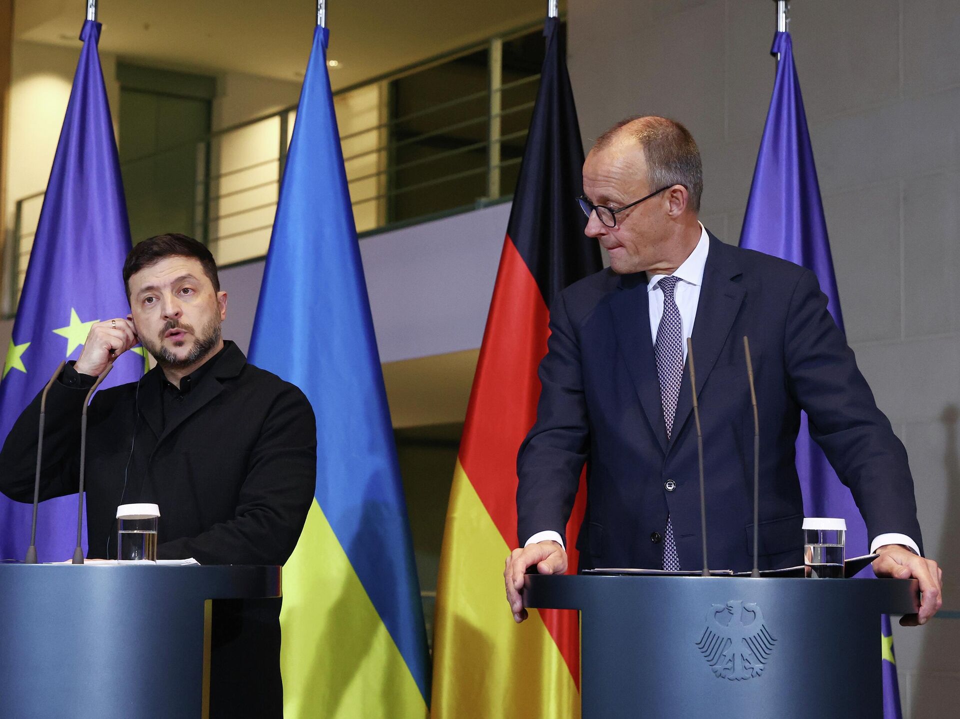 Канцлер Германии Фридрих Мерц и Владимир Зеленский во время пресс-конференции в Берлине - Sputnik Србија, 1920, 01.02.2026