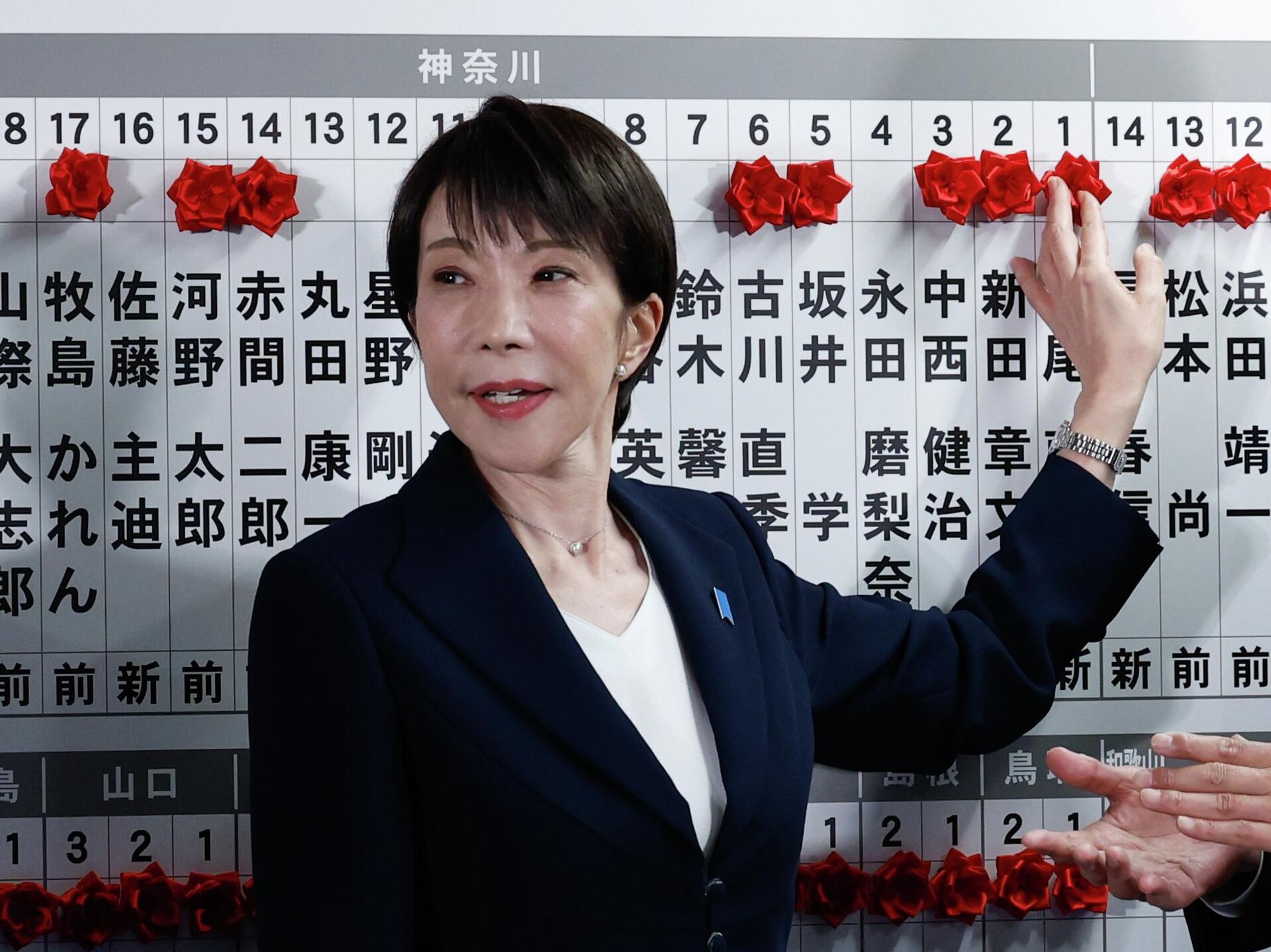 Како преноси Асошиејтед прес, Такаичи је, уз осмех, поставила велику црвену траку изнад имена сваког победника на табли у седишту ЛДП-а, док су пратећи руководиоци странке аплаудирали.