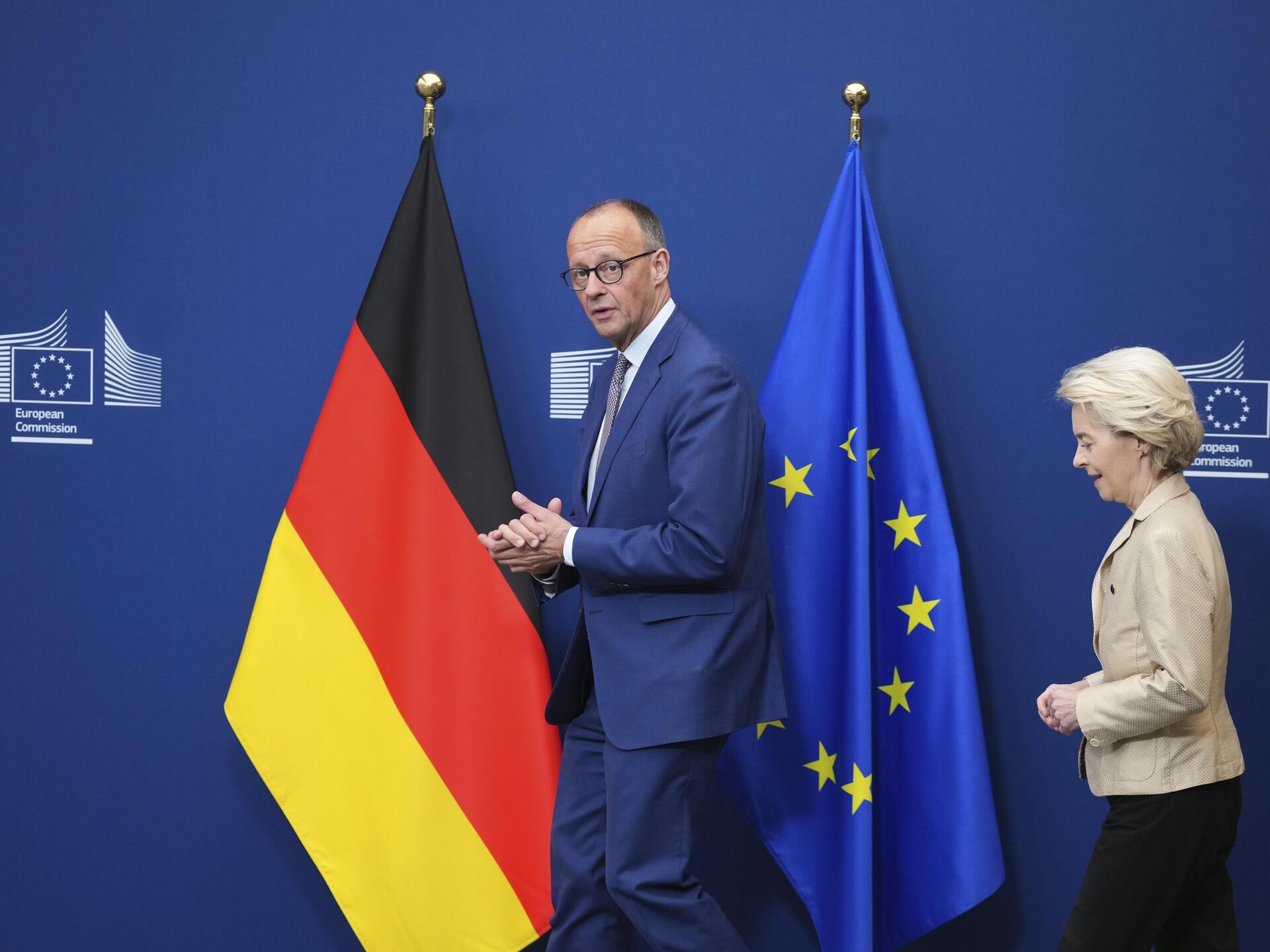 © AP Photo / Virginia MayoКанцлер Германии Фридрих Мерц и председатель Европейской комиссии Урсула фон дер Ляйен, Бельгия