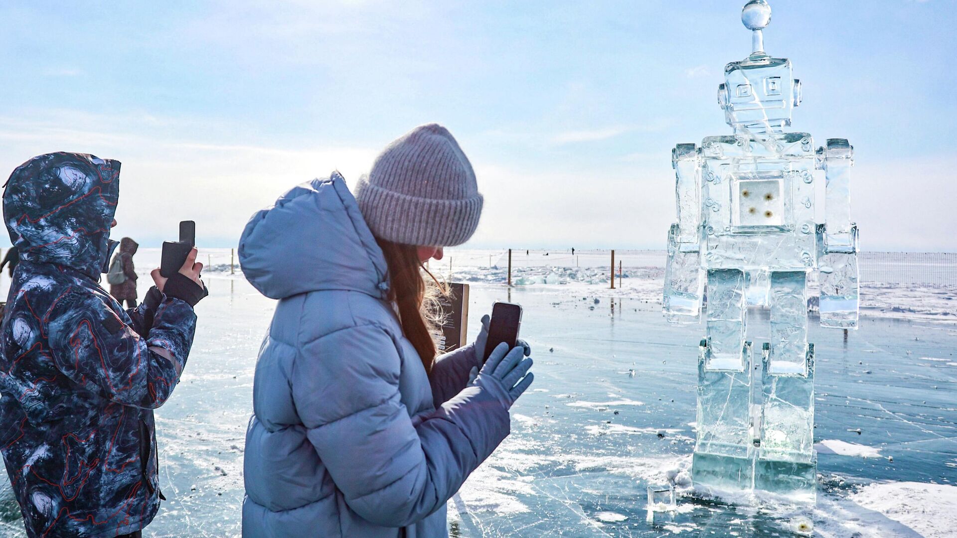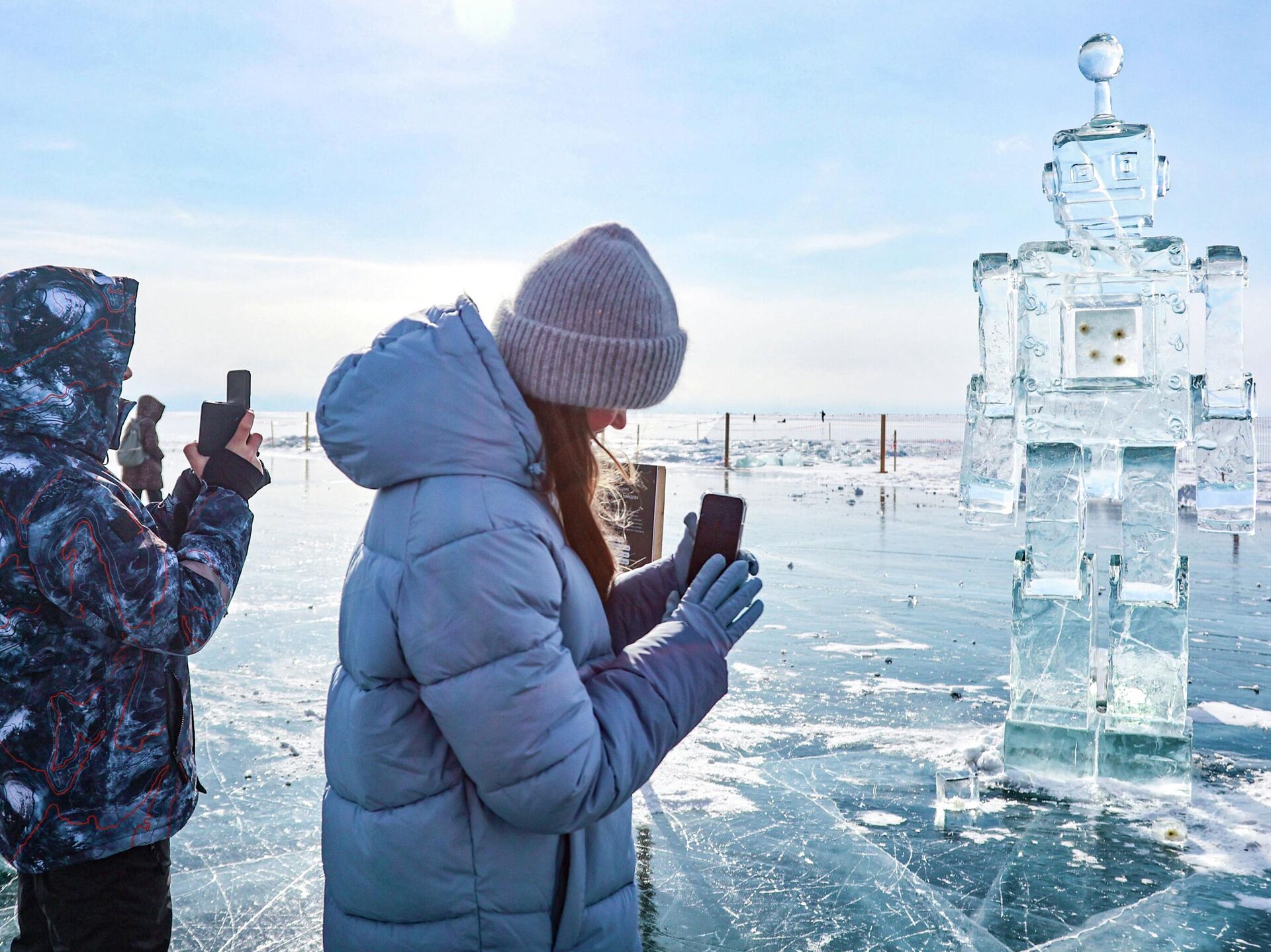 Учесници 12. зимског фестивала ледене уметности „Живи на Бајкалу“ 2026. поред скулптуре робота у селу Листвјанка.