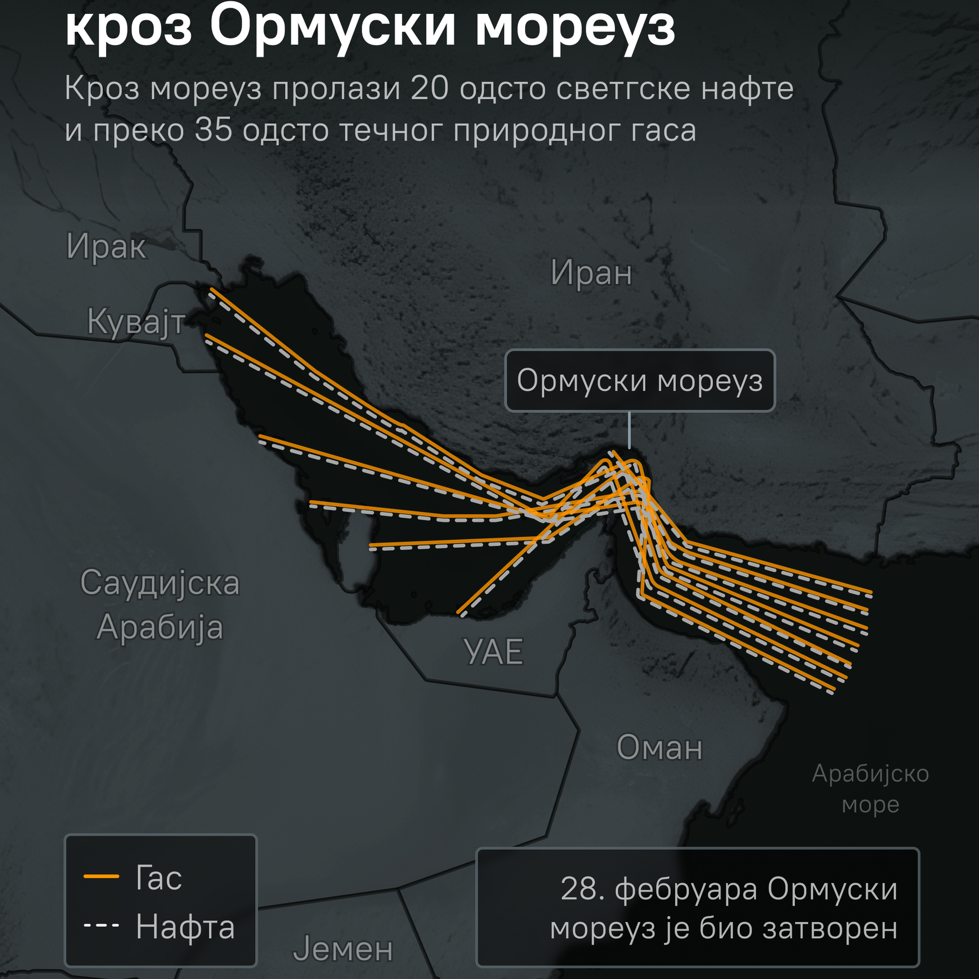 Око 30 одсто светске нафте и 20 одсто гаса пролази кроз Ормуски мореуз и то је количина која се не може лако надоместити. Углавном су те количине нафте и гаса намењене тржишту југоисточне и источне Азије, али ће се затварање Ормуза осетити у читавом свету, каже за Спутњик стручњак за енергетику Милош Здравковић.
