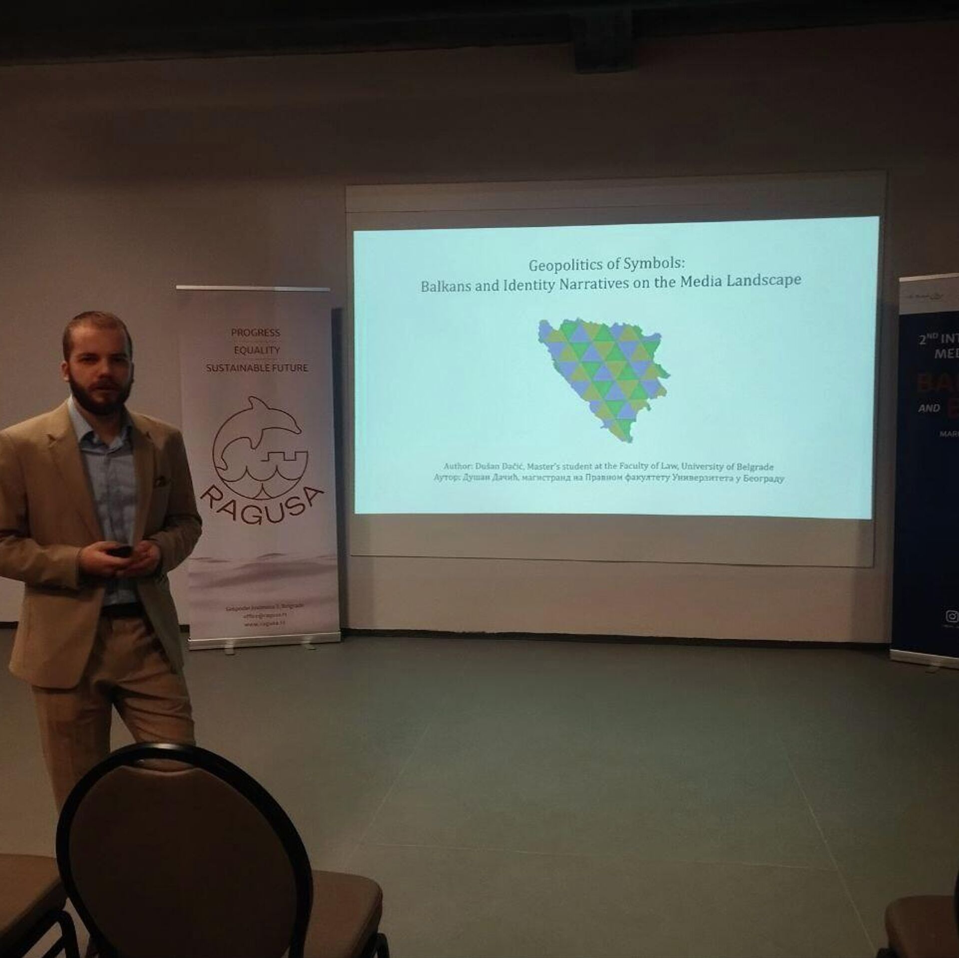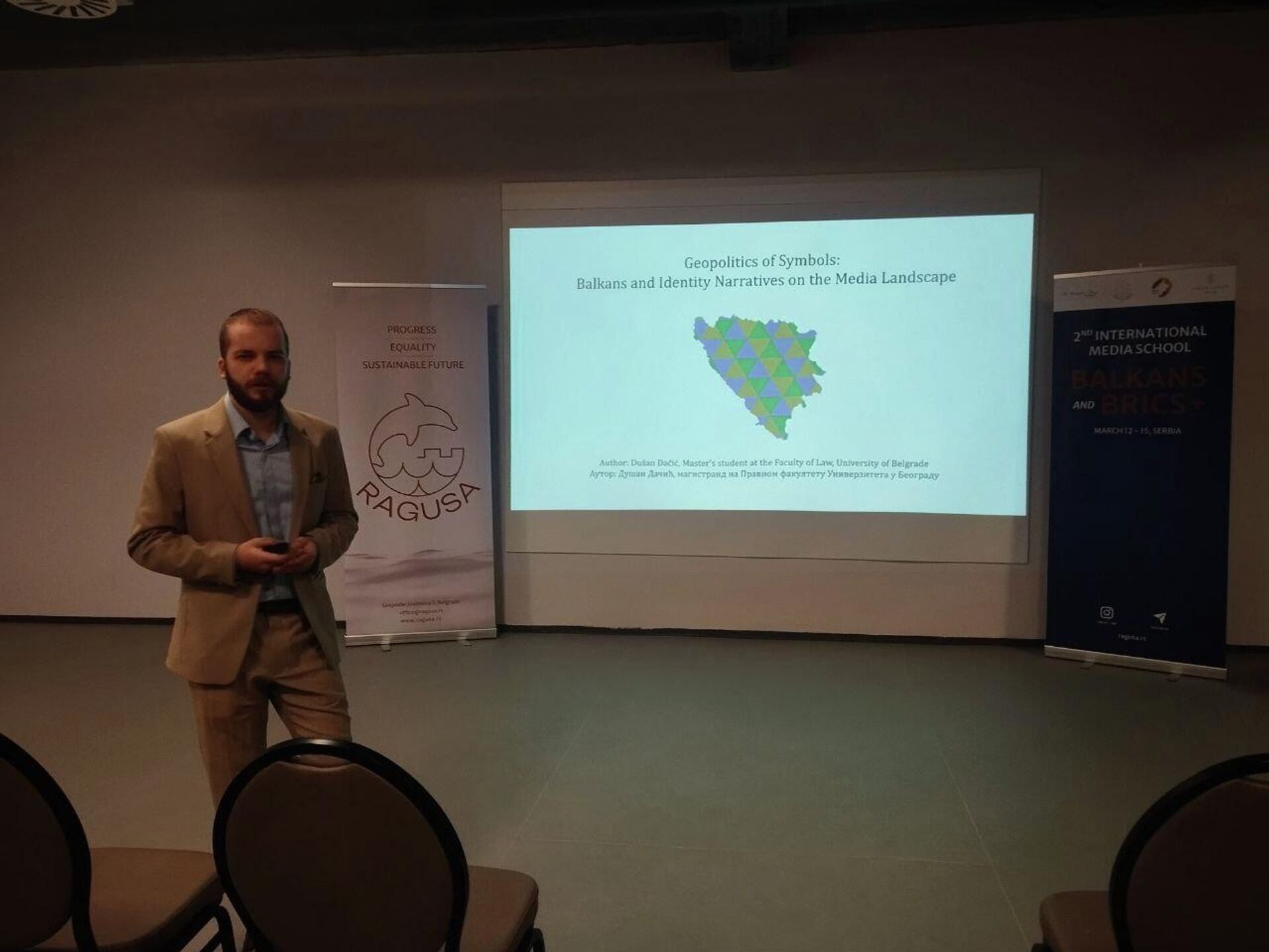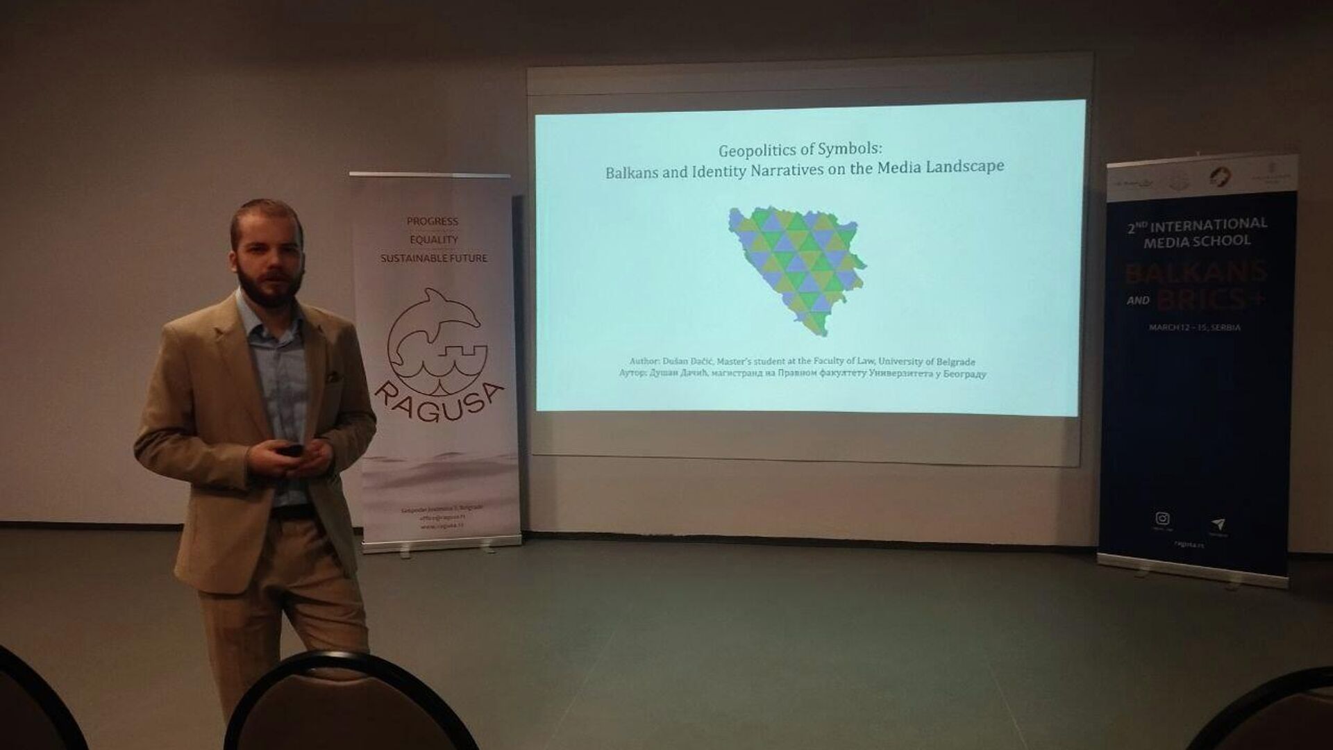 Правник и картограф Душан Дачић говорио је управо о улози и геополитици симбола, Балкану и идентитетском наративу у медијима за време рата у Босни и Херцеговини. Он је своја врло темељна истраживања представио у оквиру Друге међународне медијске школе ,,Балкан и БРИКС+", организоване од стране ,,Рагузе", а његова прича о симболици привукла је значајну публику из неколико земаља света.