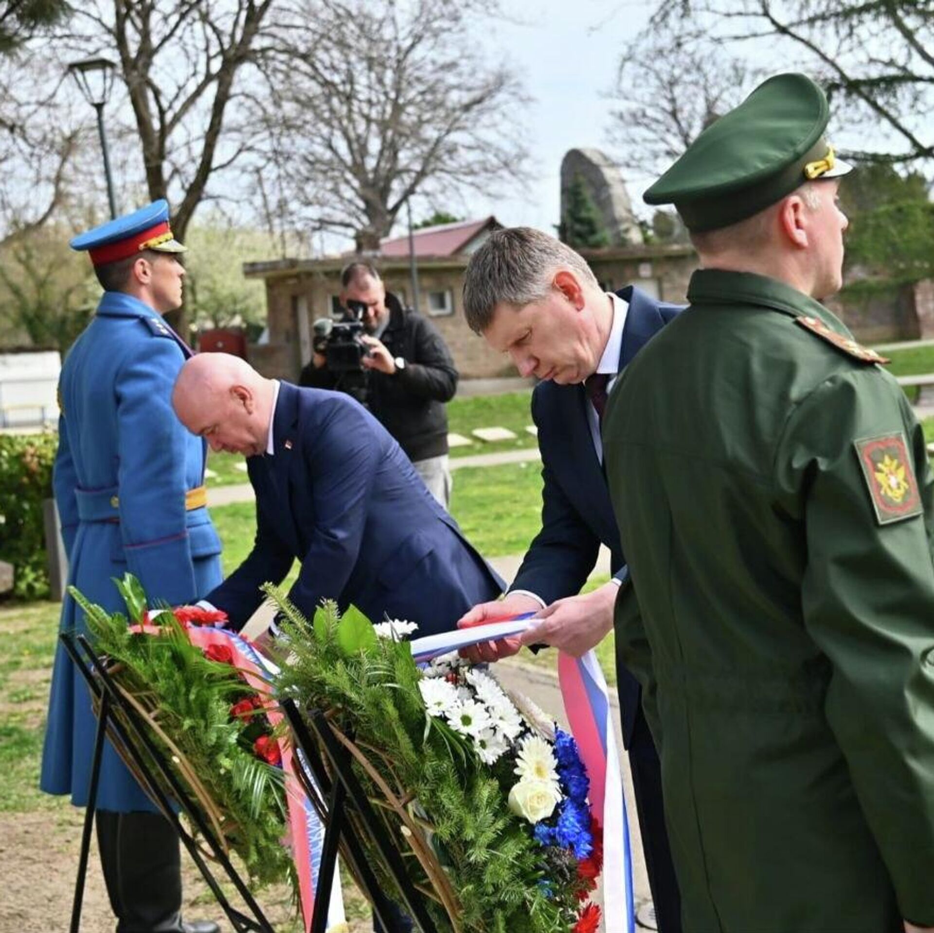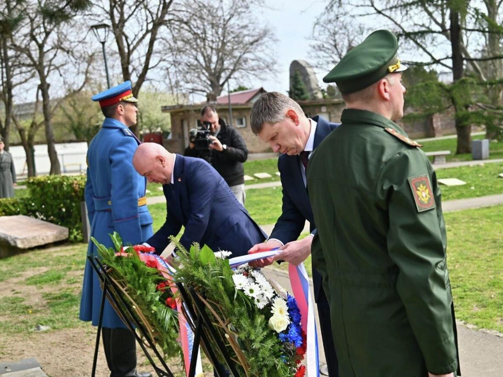 Руска делегација, заједно да министром Поповићем и амбасадором Боцан-Харченком, пре тога је положила венце на споменик Црвеноармејцу на Гробљу ослободиоцима Београда 1944.