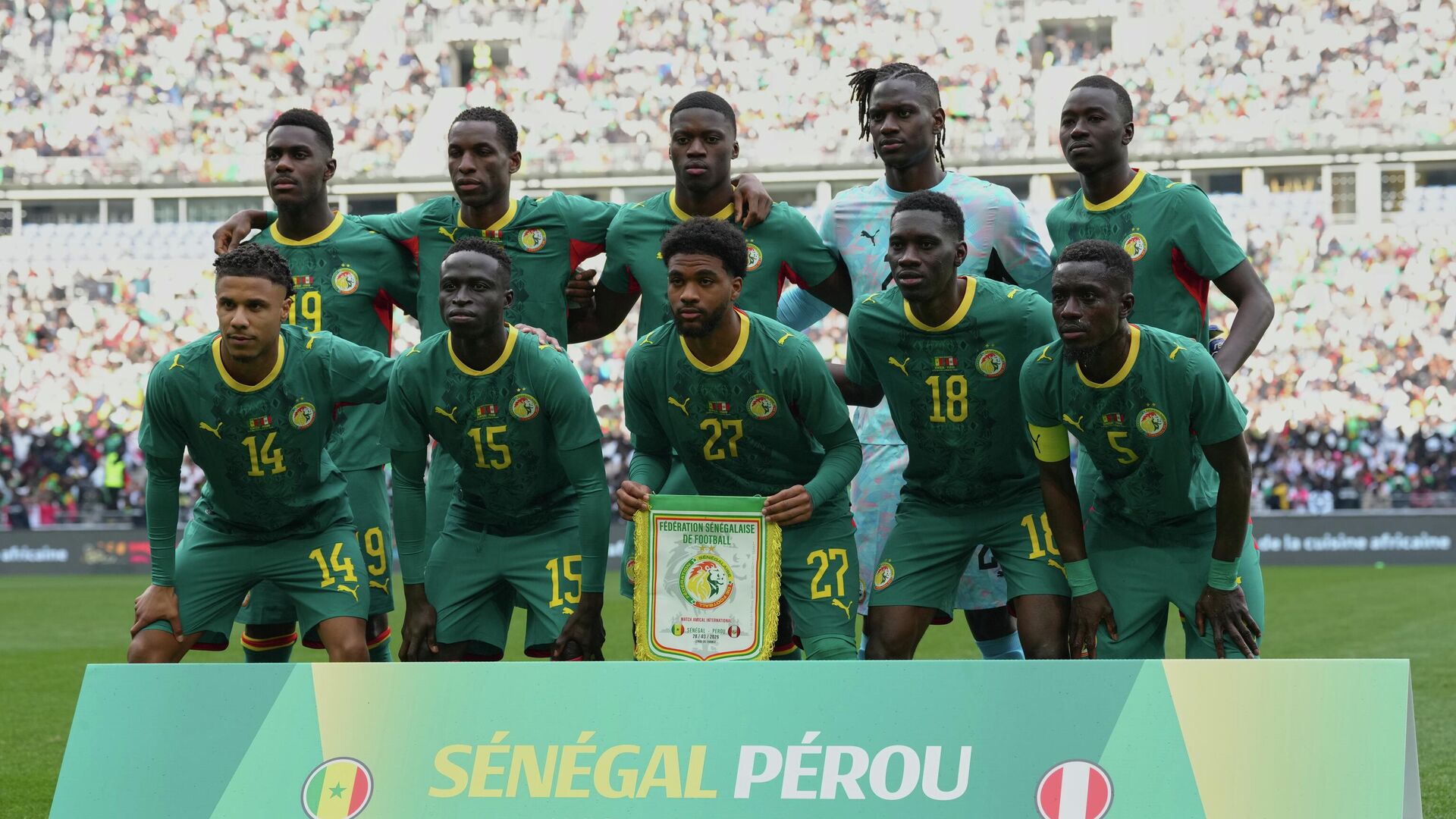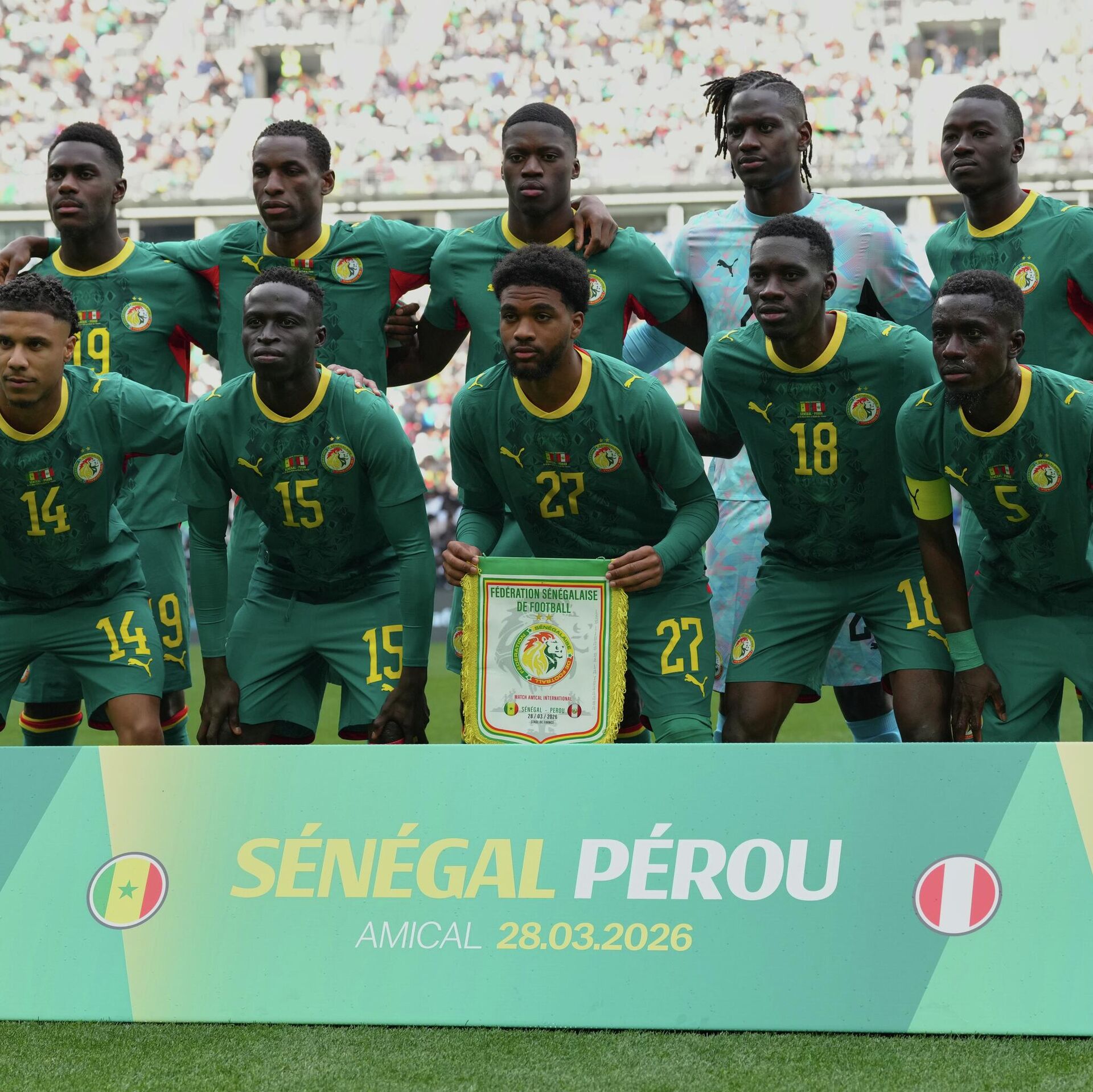 Фудбалери Сенегала су предвођени капитеном Калидуом Кулибалијем изашли на терен са пехаром као део прославе пре пријатељске утакмице против Перуа на Стадиону Француска у Паризу.