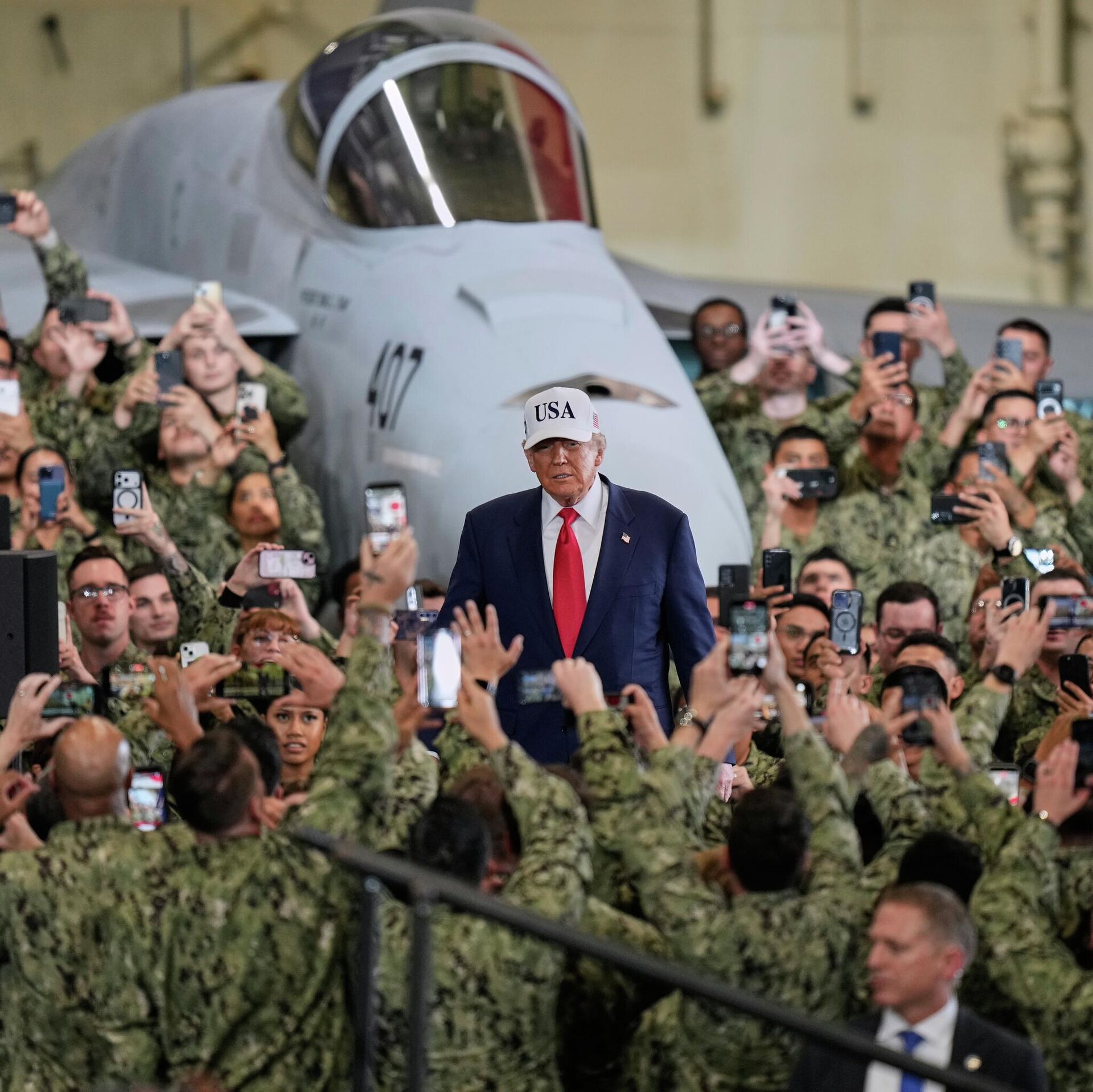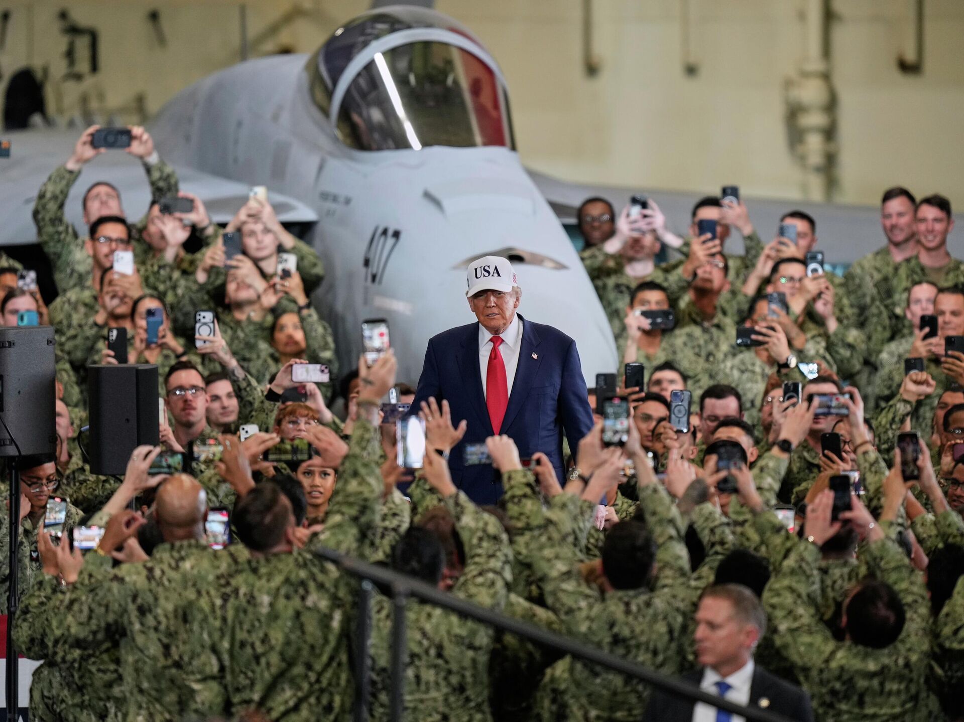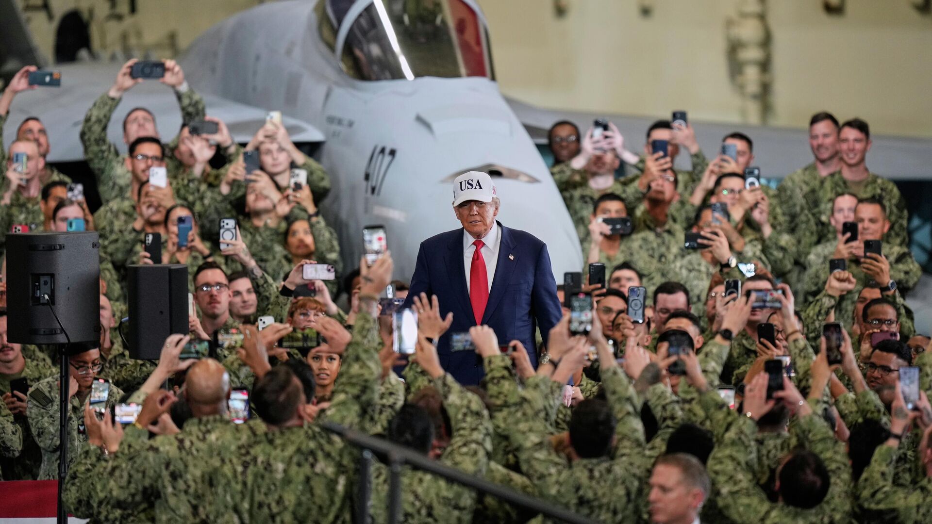 © AP Photo / Eugene HoshikoПрезидент США Дональд Трамп с военнослужащими во время своего визита на авианосец USS George Washington на базе ВМС США в Йокосуке
