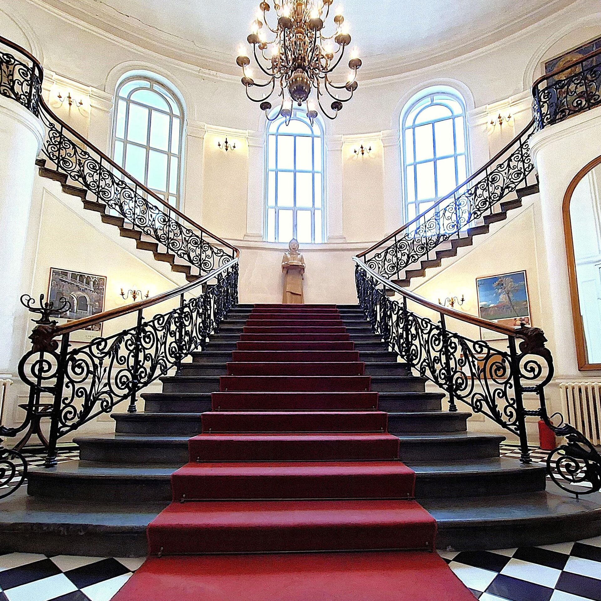 Централни хол краси и велики, вишеслојни бронзани лустер у стилу свећњака и два мозаика са геометријским и апстрактним фигуративним мотивима, смештена у лучним нишама
