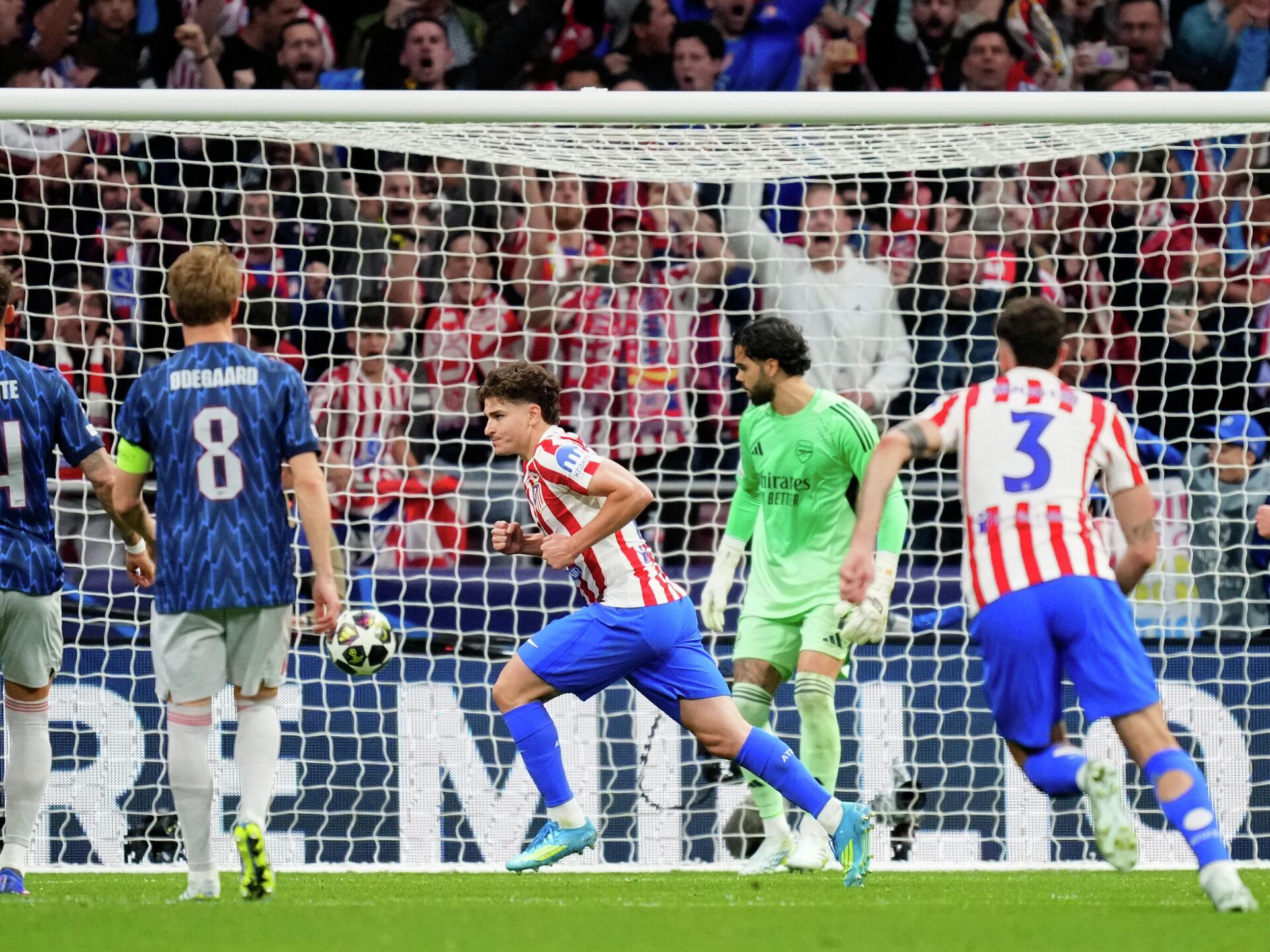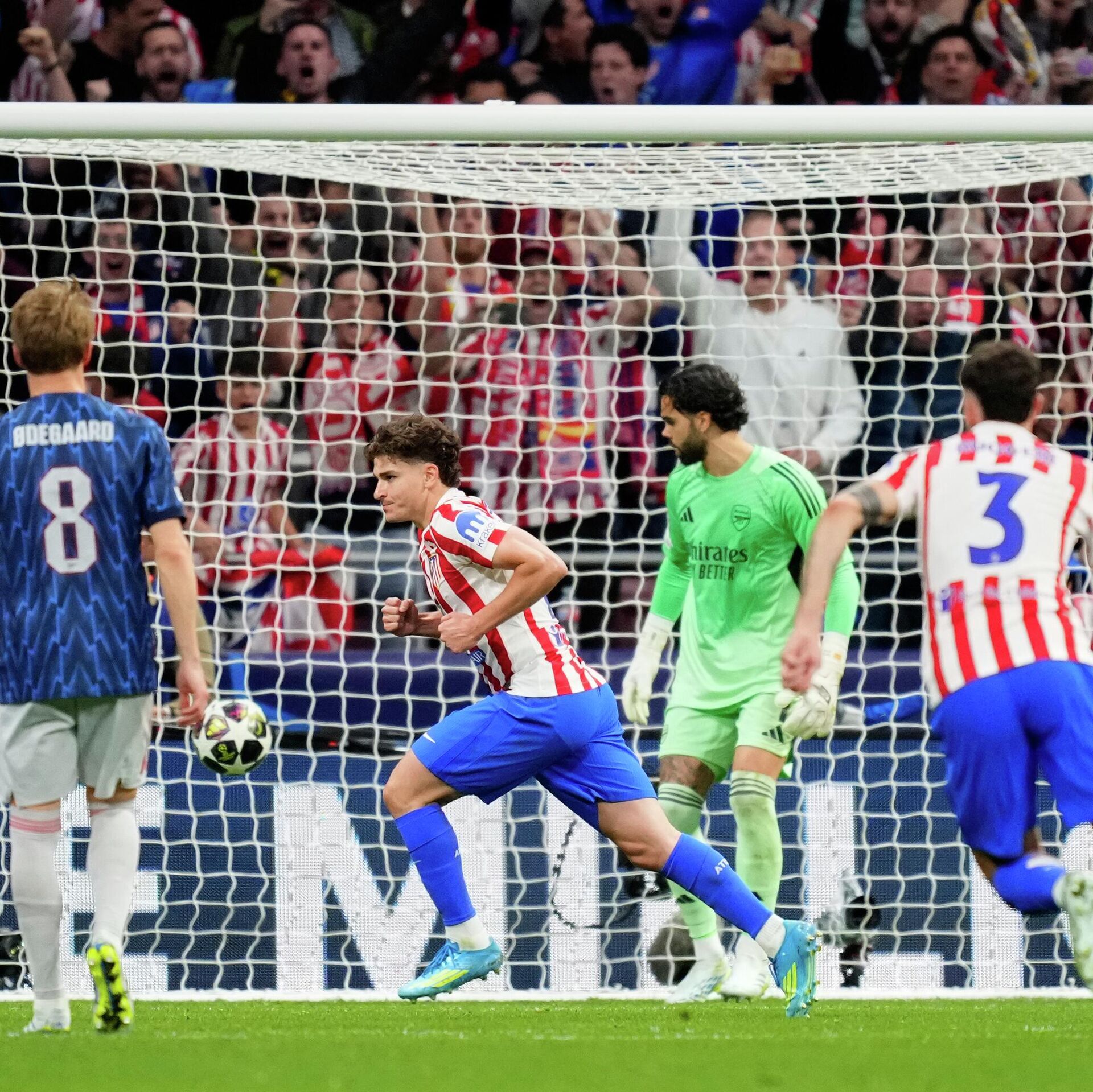 Атлетико Мадрид и Арсенал ремизирали су у првом мечу на стадиону „Ванда Метрополитано“ головима из пенала. Хулијан Алварес био је прецизан у 56. минуту.Фантастично је извео пенал, снажно и прецизно, док се голман „тобџија“ Давид Раја није померио, оставши „укопан“ на средини гола.Био је то 25. погодак популарног „Паука“ у његовом 41. мечу у Лиги шампиона, док је најбољем свих времена Лео Месију за такав подвиг било потребно 42 меча, а Куну Агуеру 48 утакмица.Реванш меч полуфинала између Арсенала и Атлетико Мадрида заказан је за 5. мај од 21 час на стадиону Емирати.